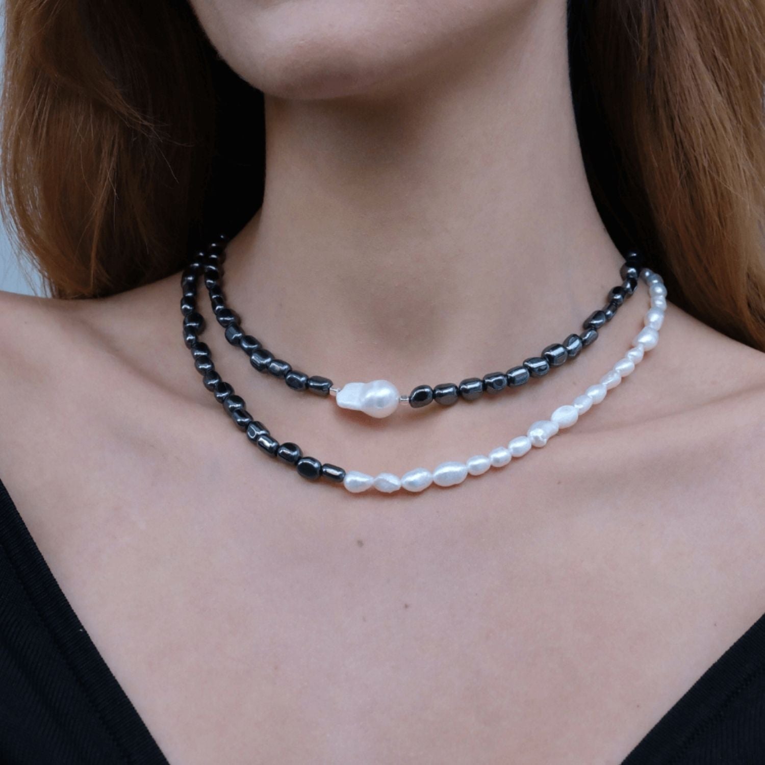 This necklace is made with natural black and white pearls. It is handcrafted in a workshop.