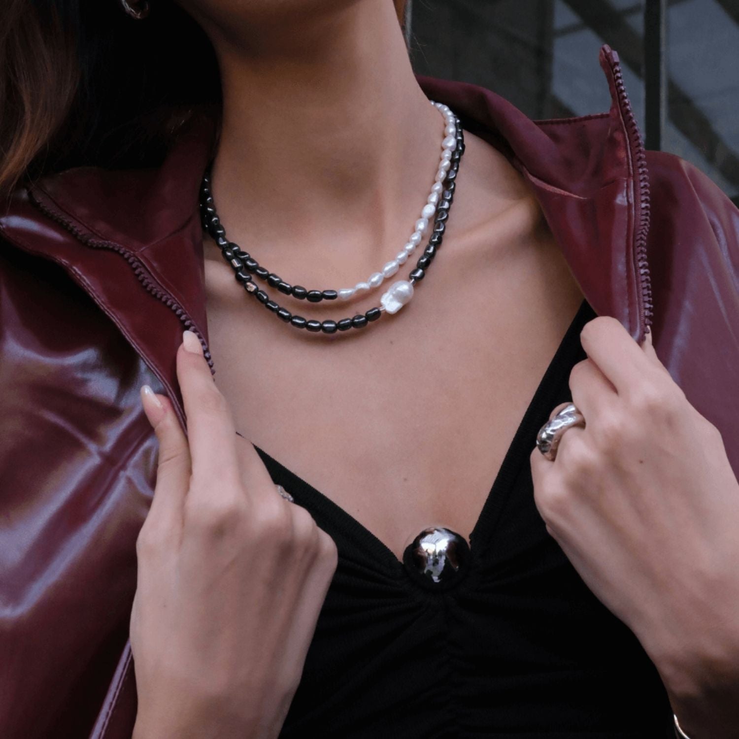 This Maori Black White Pearl Necklace by Linya Jewellery is an elegant and stylish necklace with a dual design. It features a harmonious blend of natural black and white pearls, each with a unique character. The black pearls symbolize nobility and mystery, while the white pearls represent purity and elegance, offering a striking and contrasting appearance.