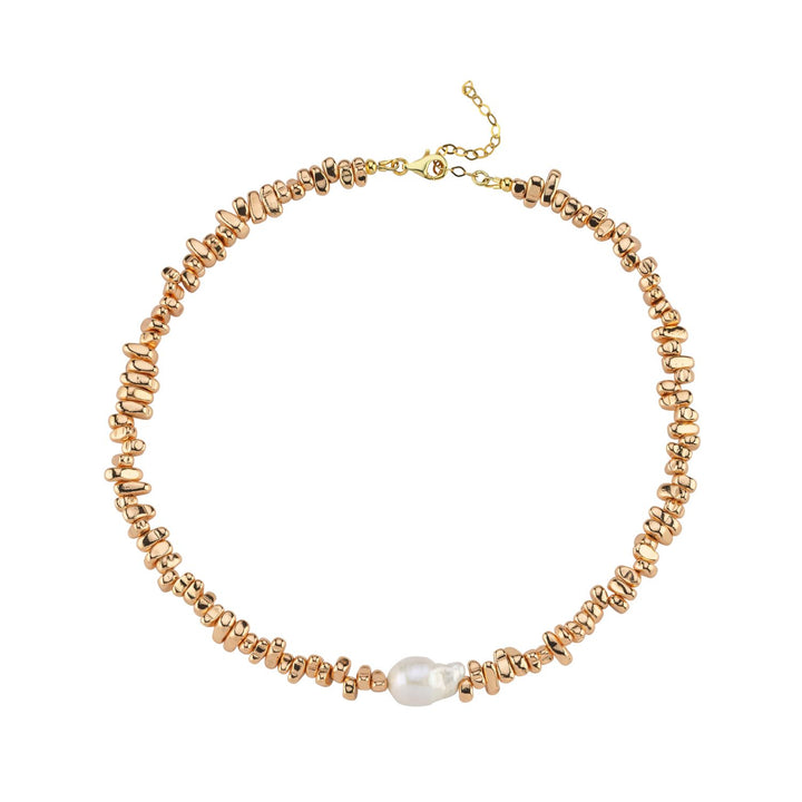 This necklace is made of 925 sterling silver with a 22k gold plated finish. It features natural baroque pearls and hematite stones. The necklace is 40cm long with a 5cm extension chain.