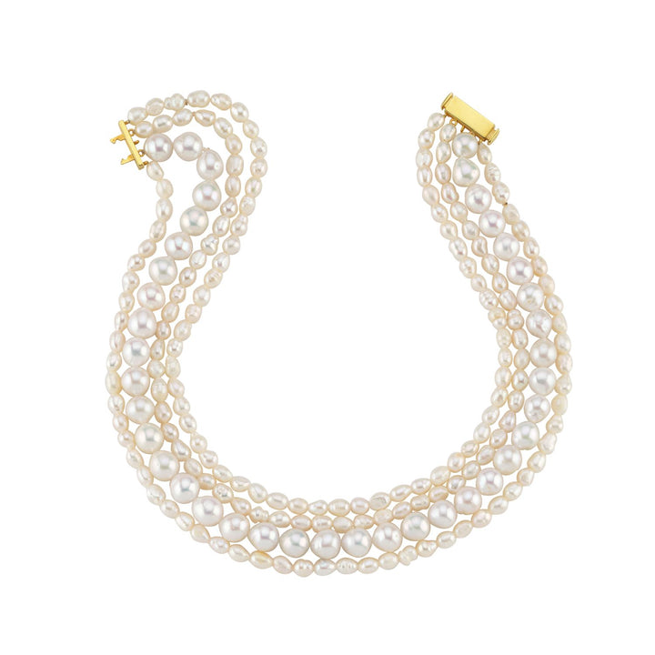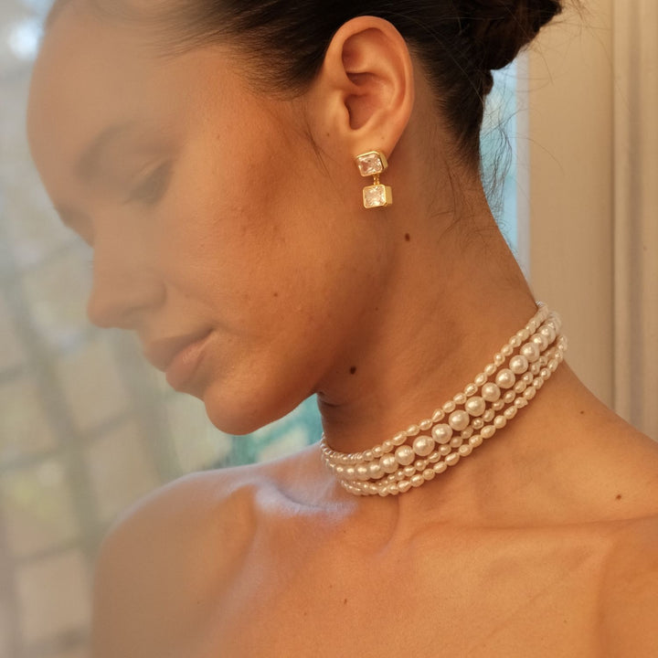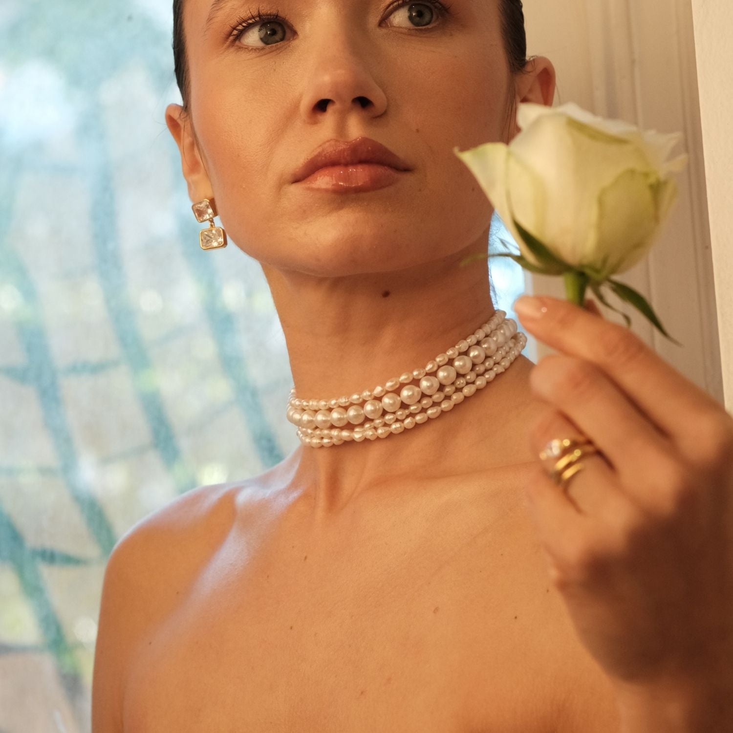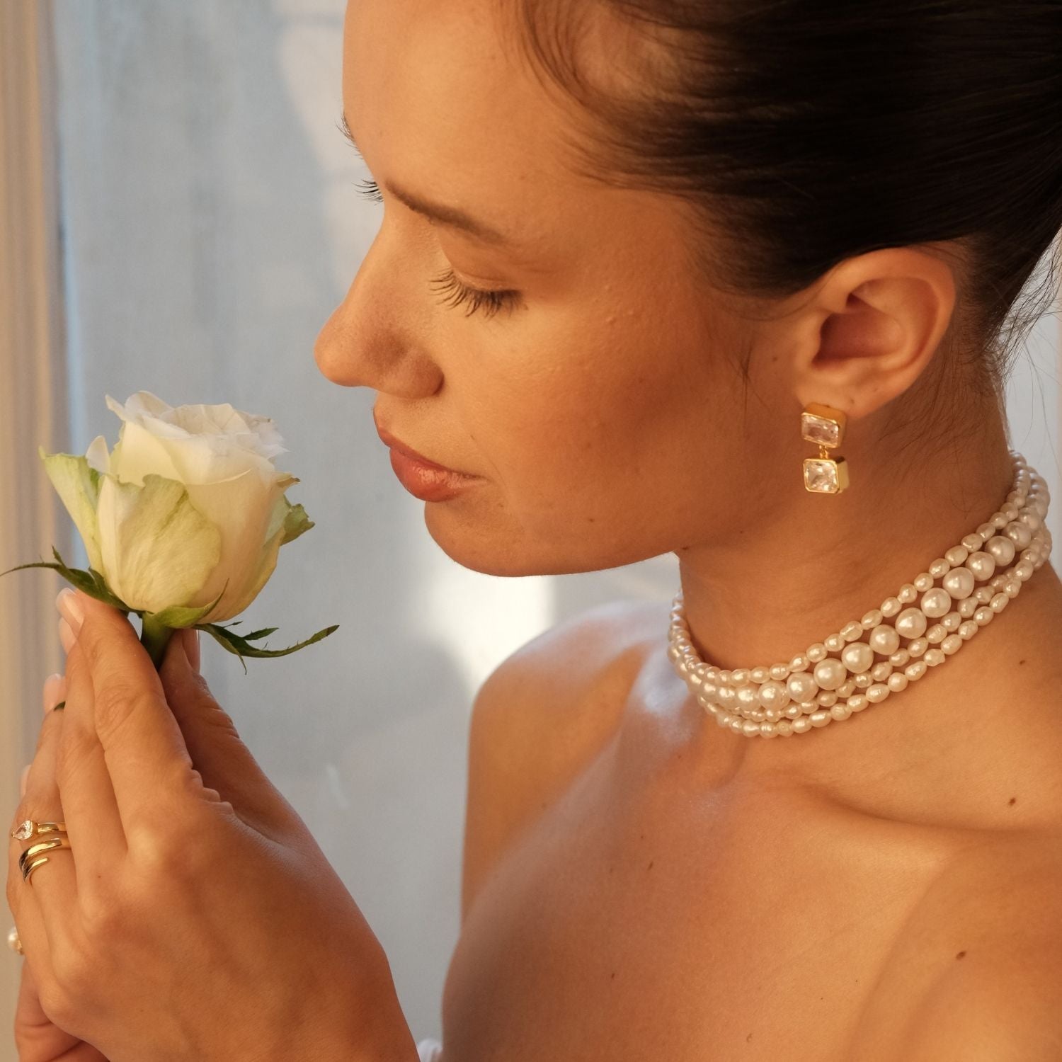 The Amour Multi Pearl Choker by Linya Jewellery is a special design that combines the elegance of classic pearls with a modern touch. This choker fits perfectly around the neck and is ideal for both daily use and special occasions, such as weddings. The natural pearls lined up in rows add a dazzling sparkle, making it an ideal choice for those who want to attract attention without compromising on simplicity.