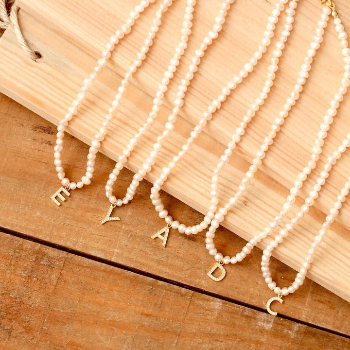 This handmade necklace is described as having a natural pearl and a gold-plated initial. The initial is 'M'.