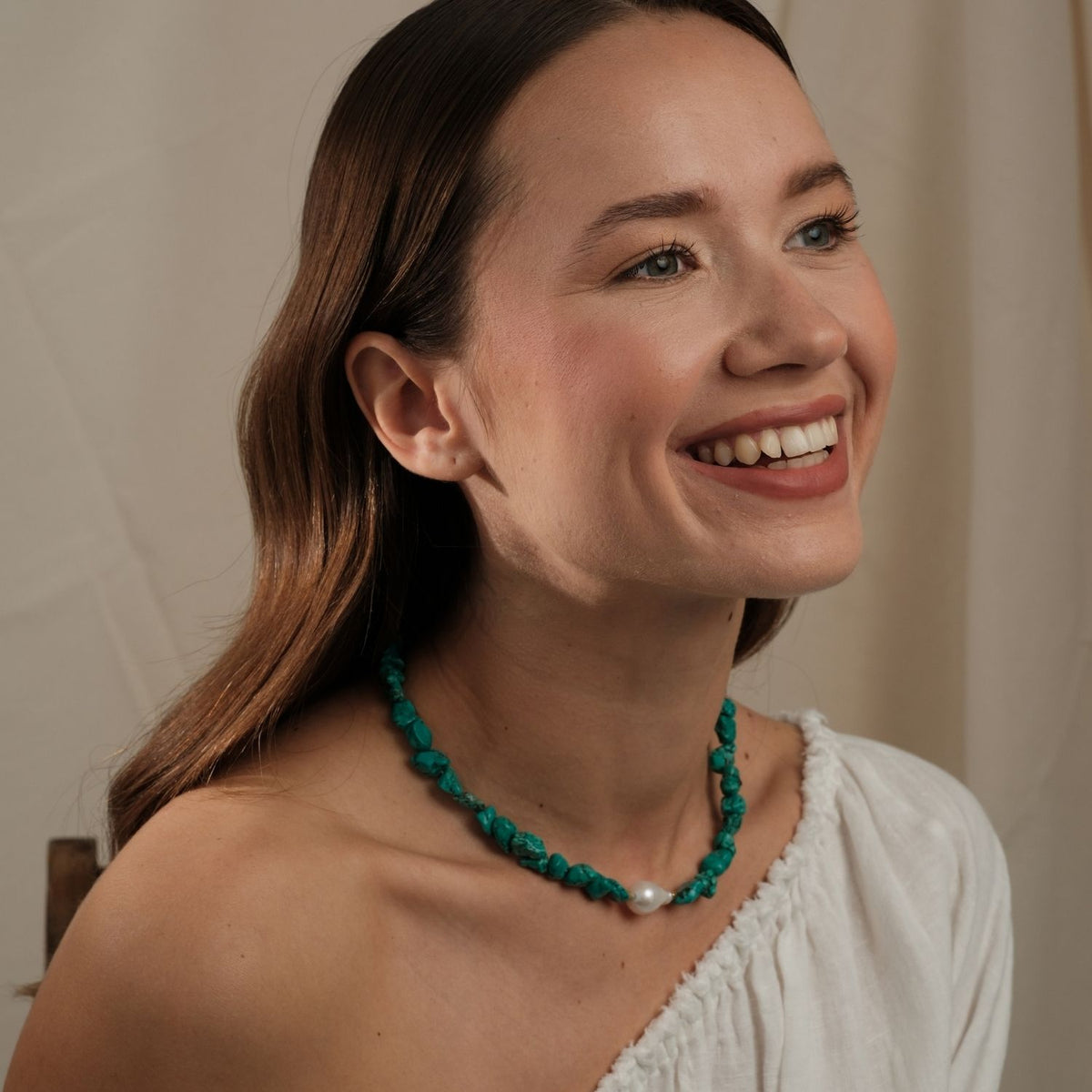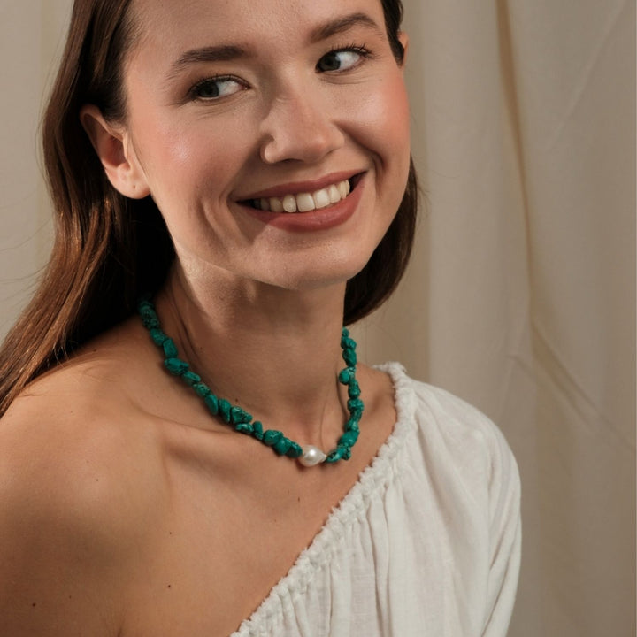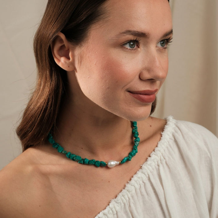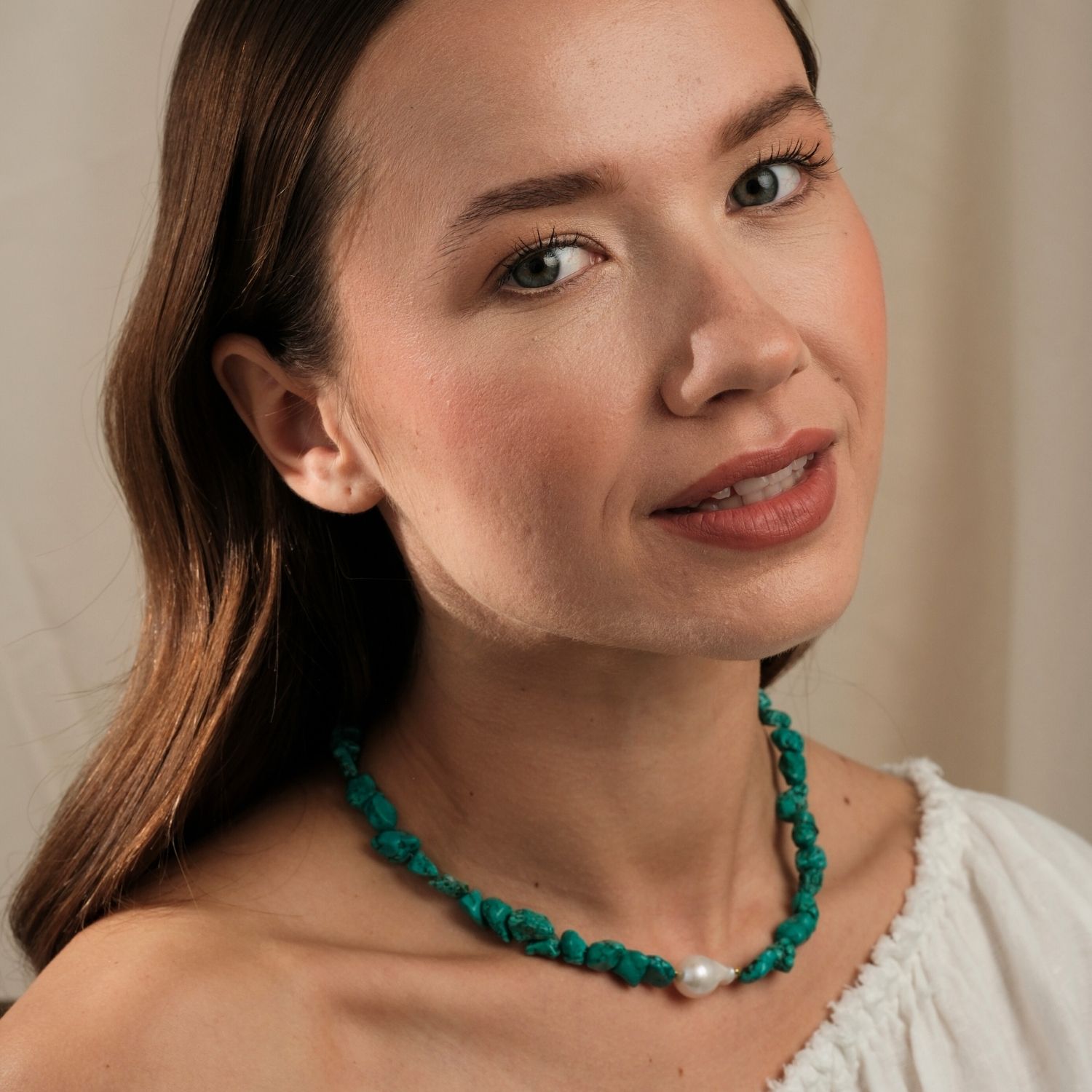 This Ephyra Baroque Pearl Turquoise Necklace by Linya Jewellery is a unique, handmade design that combines the coolness of the sea with the irregularity of nature. It features unique baroque pearls and vibrant turquoise stones for a simple yet impressive harmony. Made of 925 sterling silver with 22k gold plating, this necklace is a favorite for those who value originality.