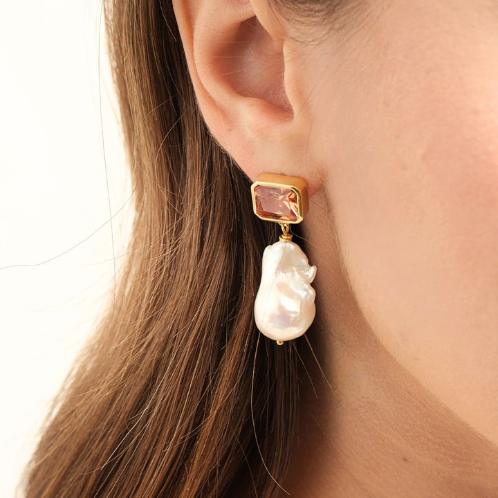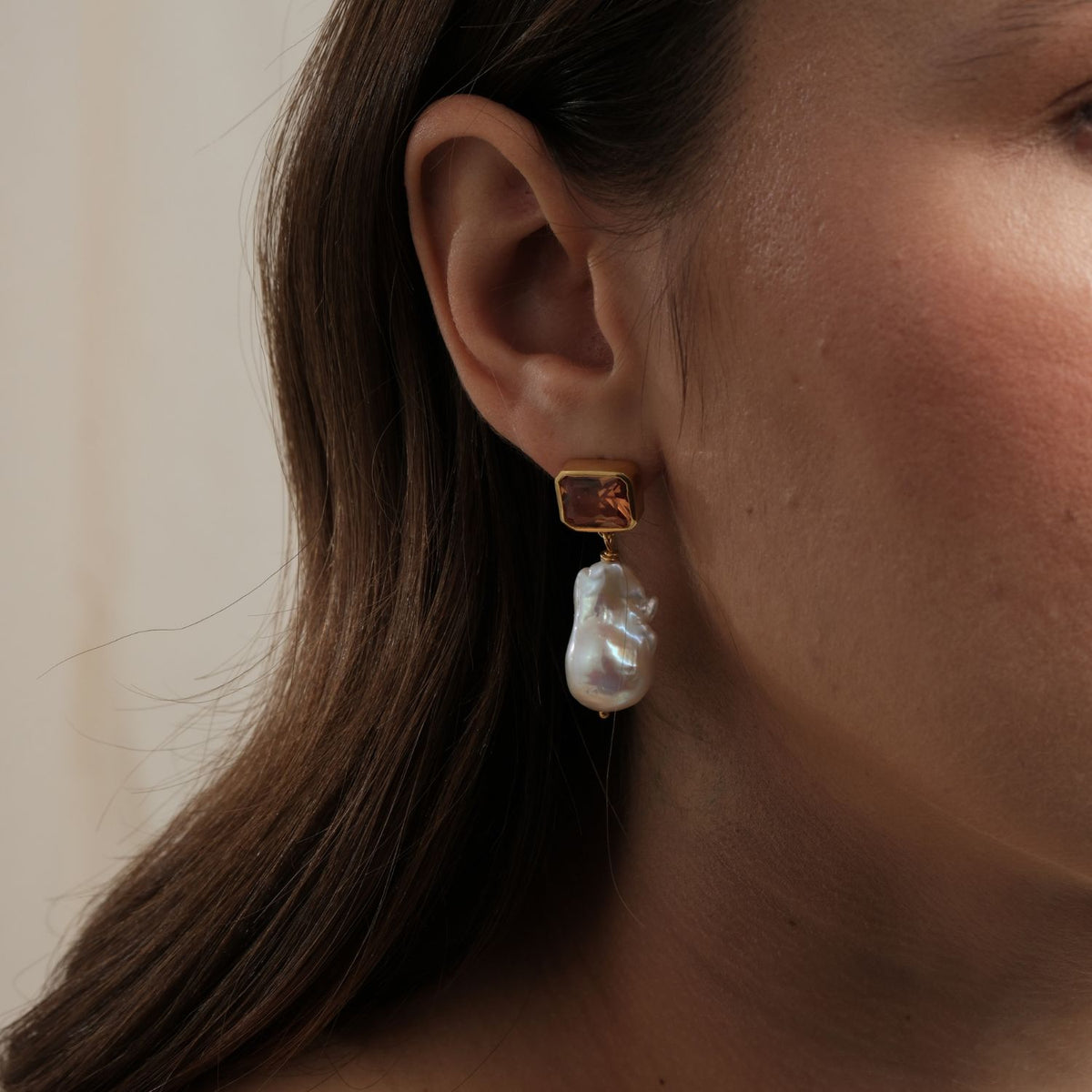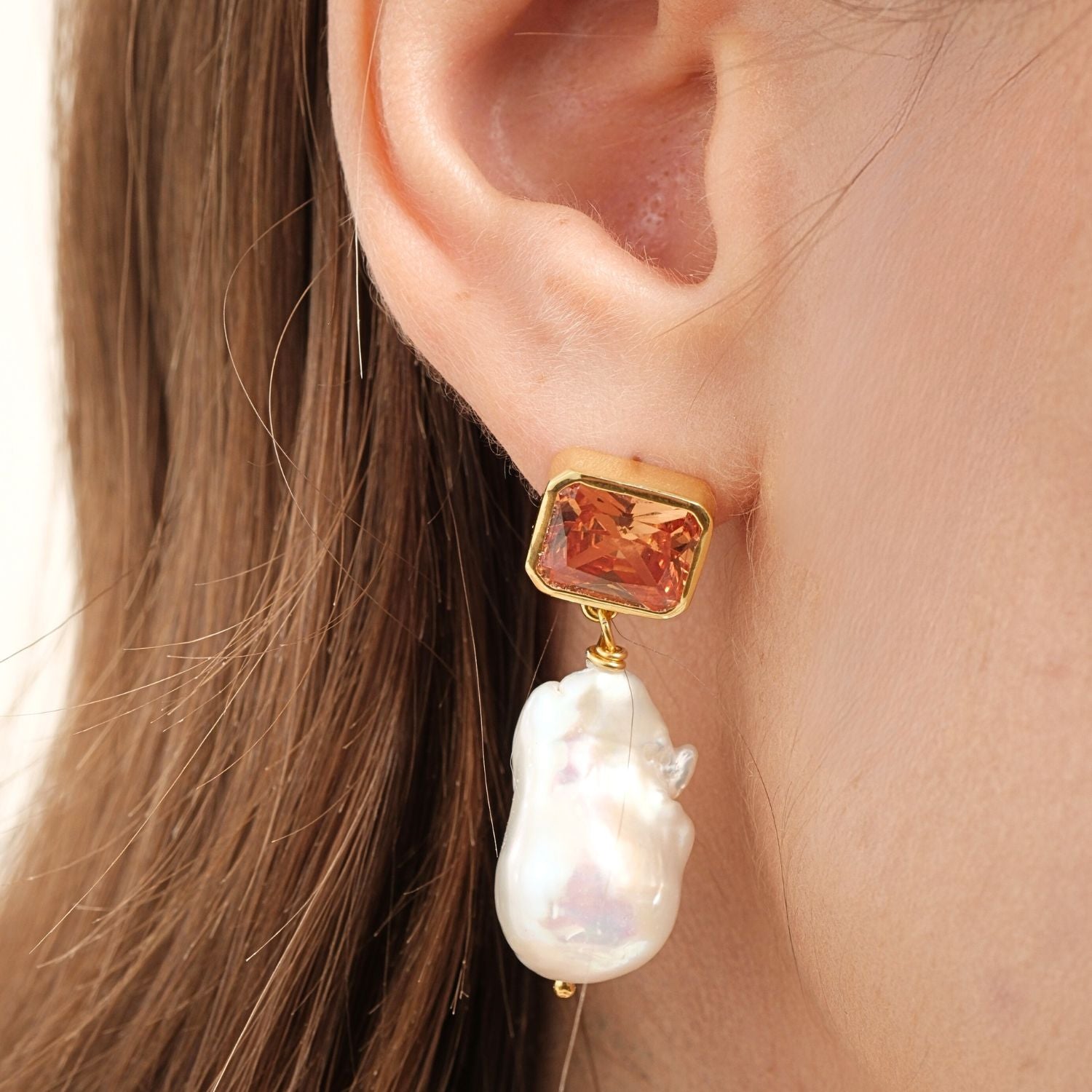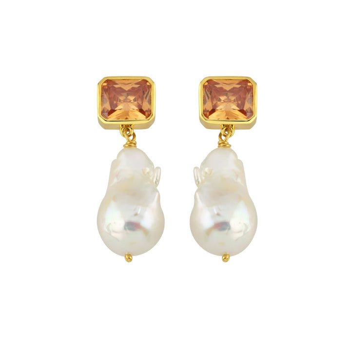 Champagne Crystal Stone Baroque Pearl Dangle Earrings