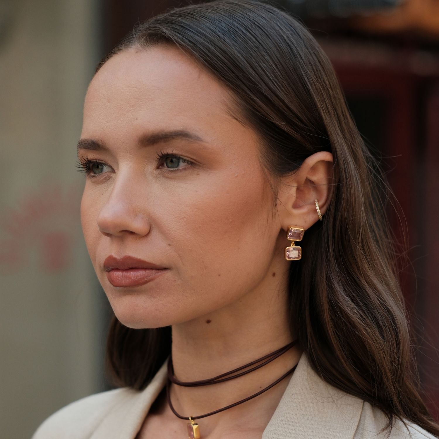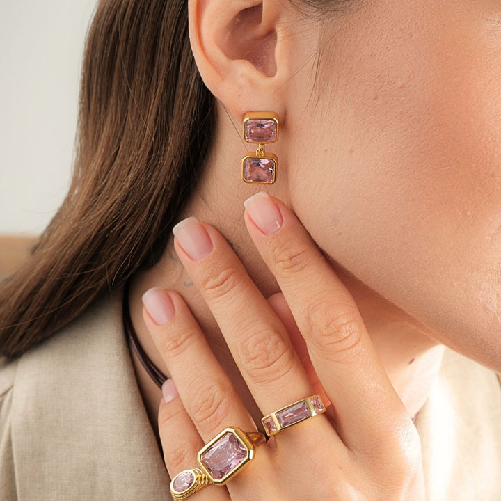 These Pink Double Crystal Stone Dangle Earrings by Linya Jewellery are an elegant and modern accessory. They feature dangling crystal stones in various colors, including pink, white, blue, khaki green, and champagne, offering a dynamic sparkle. Made from 925 sterling silver with 22k gold plating, they reflect light beautifully, adding an elegant touch to any style.