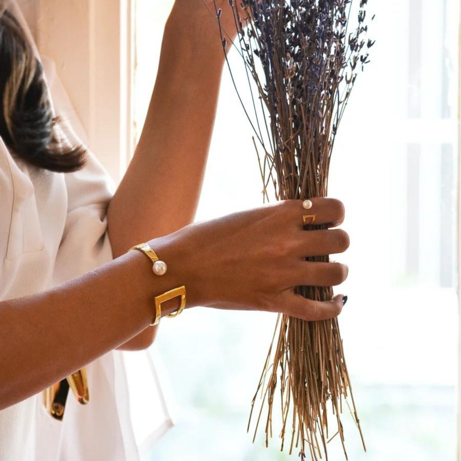 This Pearl Cuff Bracelet by Linya Jewellery is an elegant and sophisticated piece, carefully handcrafted by experienced artisans. It combines precious, real pearls with meticulous workmanship and high-quality materials to ensure long-lasting use. The cuff's solid connections and careful plating preserve the pearls' beauty and increase the bracelet's durability, making it an elegant and timeless accessory.