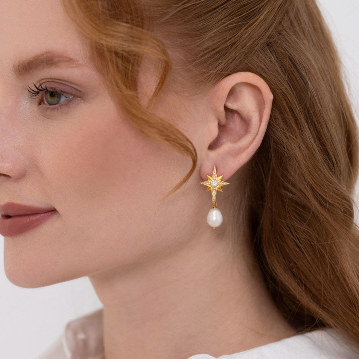 Pole Star Pearl Dangle Gold Earrings