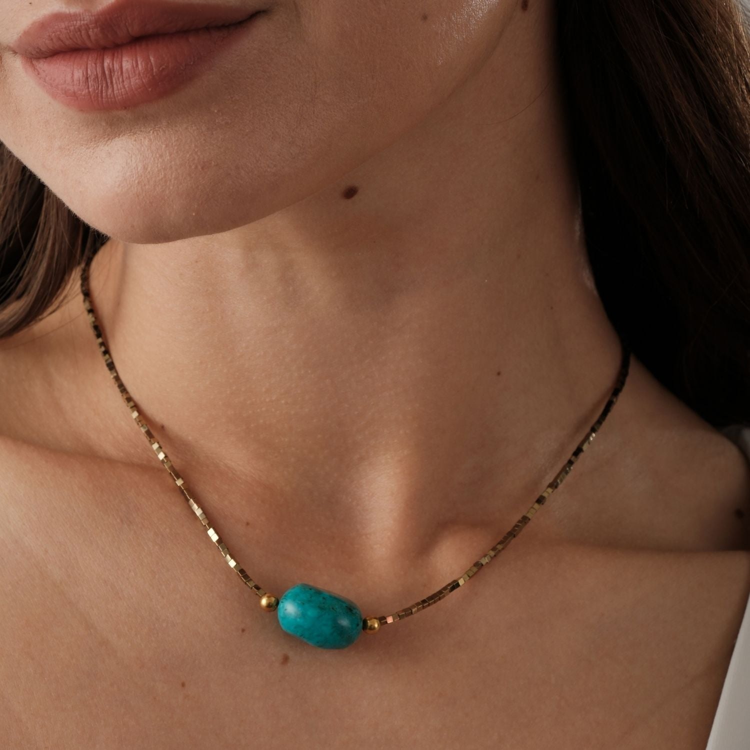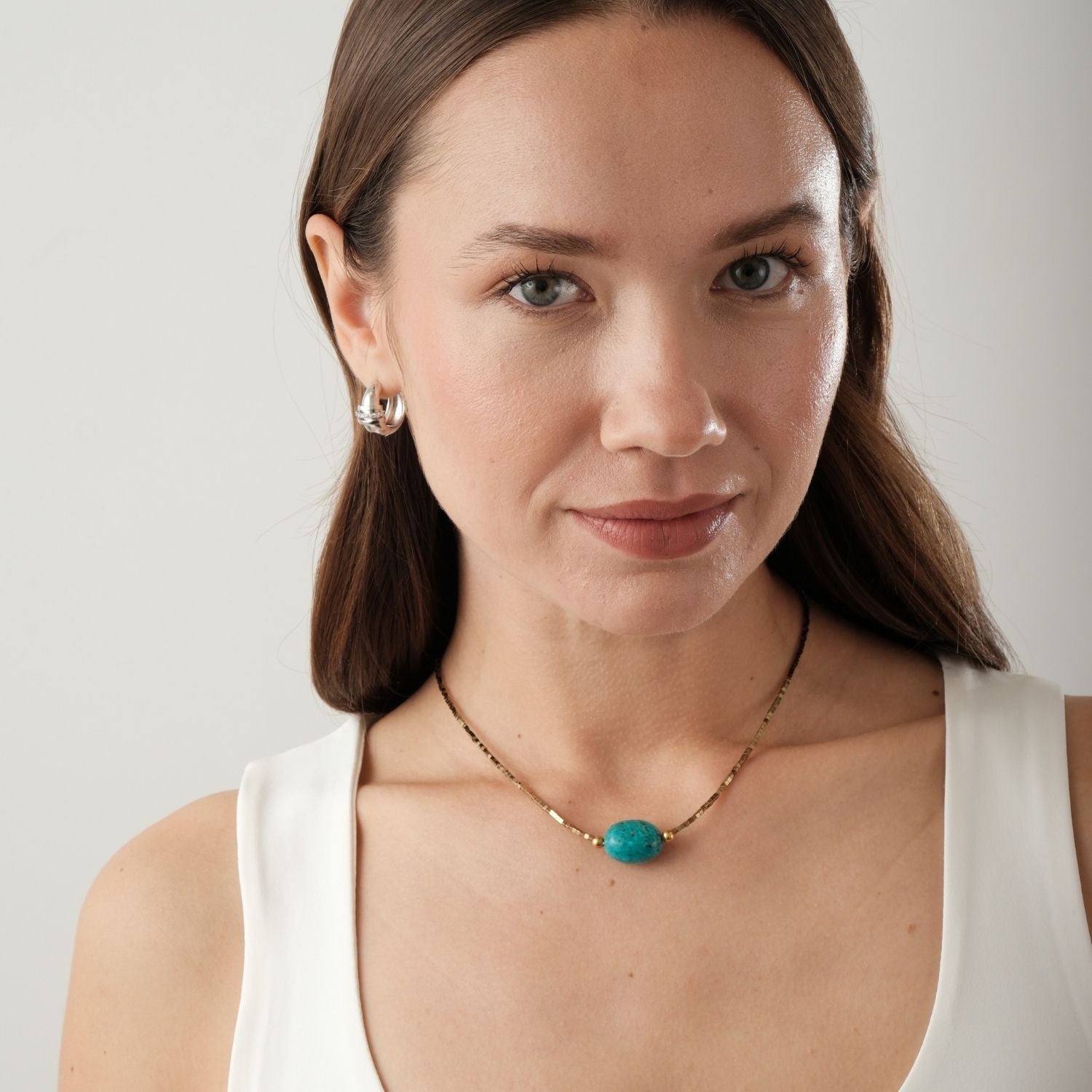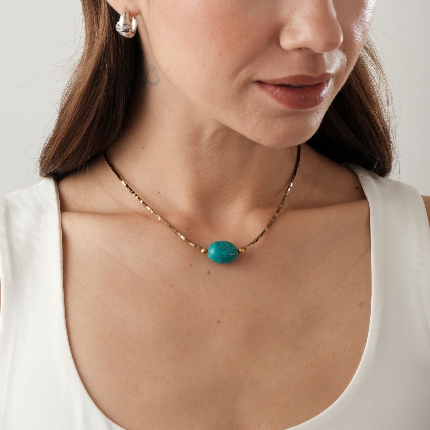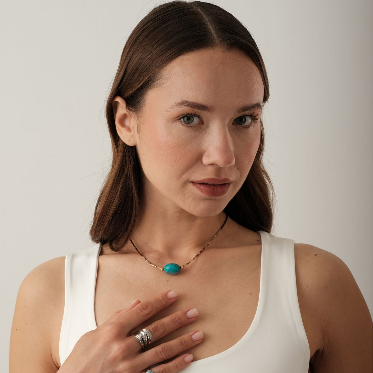 This Delphi Turquoise Stone Hematite Necklace by Linya Jewellery has an elegant and powerful design inspired by nature. The combination of small-sized hematite stones and a large turquoise stone in the middle creates a striking contrast. This piece offers a minimalist yet impressive style, carrying the energy of natural stones and making it a perfect choice for adding a sophisticated touch to any outfit.