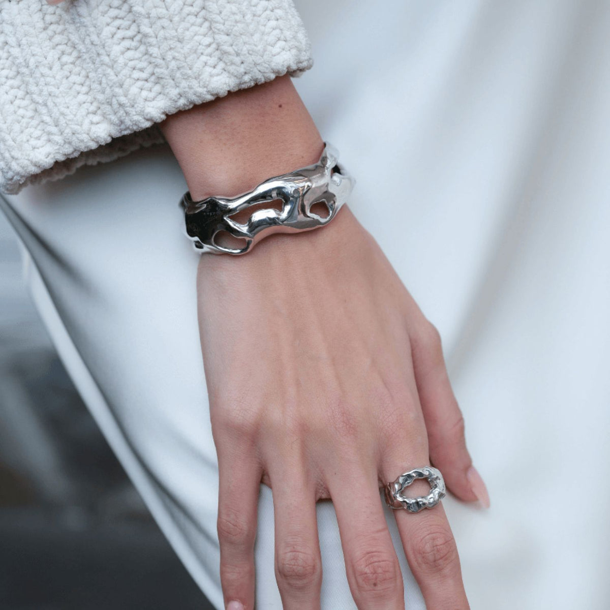 This cuff bracelet is made of high-quality materials and is handcrafted in a workshop. It is available in silver.