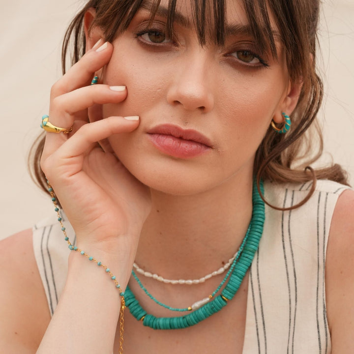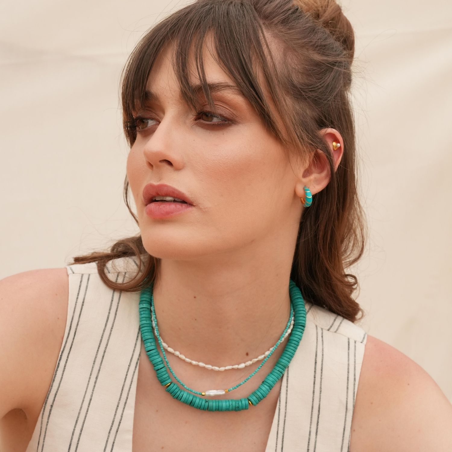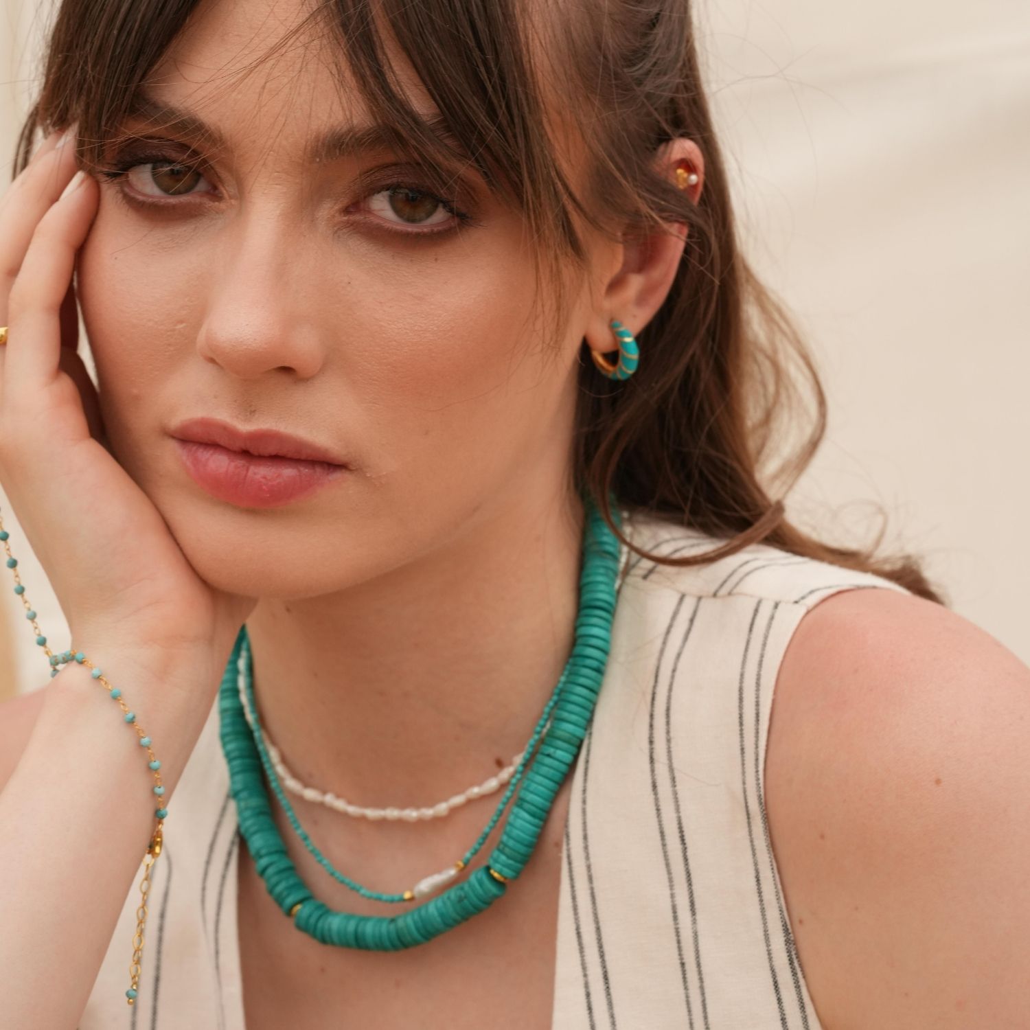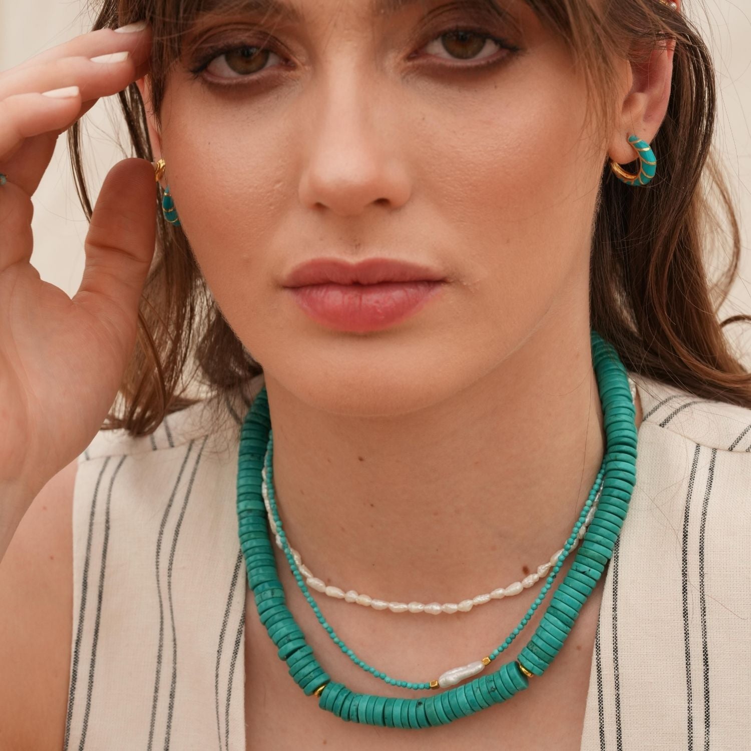 This Bono Turquoise Big Necklace by Linya Jewellery is an eye-catching piece from the brand's summer collection. It features a beautiful turquoise stone that reflects the freshness of nature and symbolizes the energy of summer. With its elegant and impressive design, this necklace is an ideal option for both daily wear and special occasions, adding a refreshing and lively touch to your style.