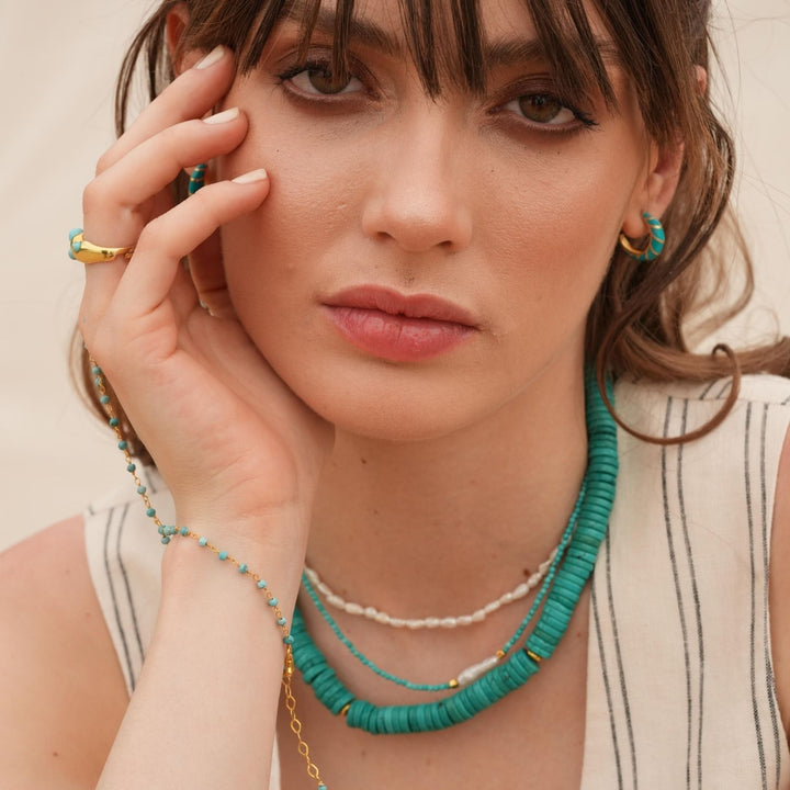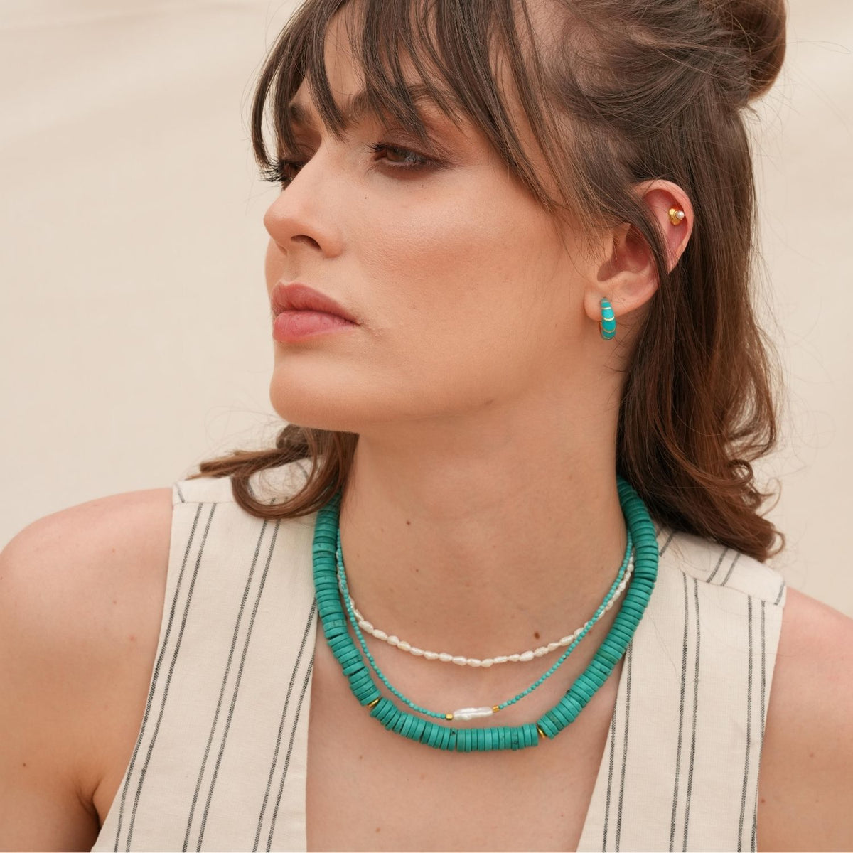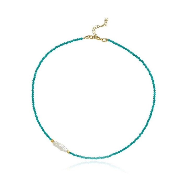 This Meg Turquoise Small Pearl Necklace by Linya Jewellery is a chic and elegant piece from the brand's summer collection. It reflects the freshness of nature and the energy of summer with its elegant turquoise pearls and baroque pearl details. This necklace combines classic and modern styles, making it a perfect and versatile choice for both daily wear and special occasions.