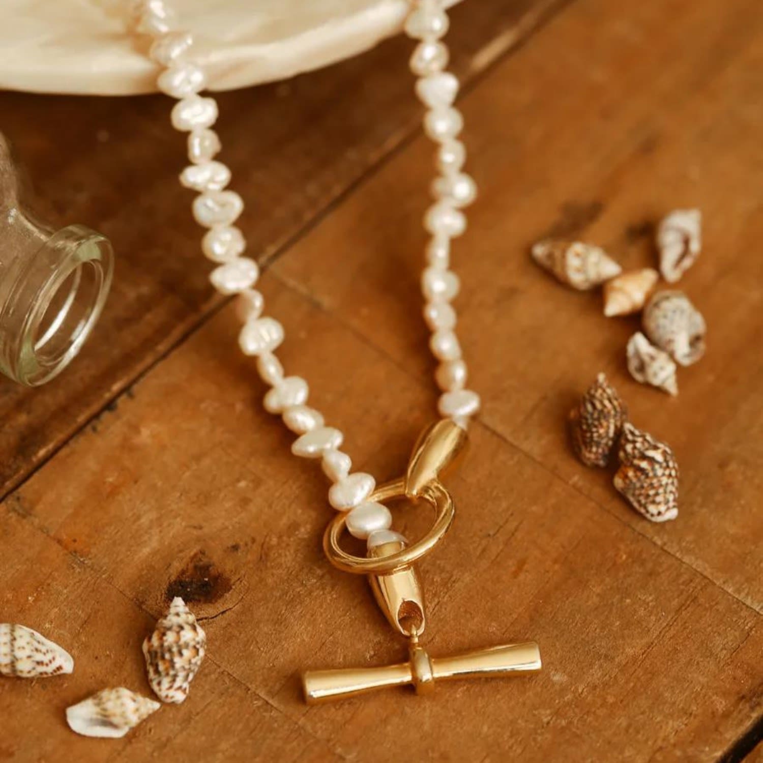 This Sand Pearl Gold Necklace by Linya Jewellery allows you to wear the unique beauty of nature. It features sand pearls, which have a natural and captivating appearance, and a modern "T" shaped clasp. Each pearl is carefully selected to create a harmonious design. This necklace is the perfect accessory to add a touch of luxury and elegance to any outfit, making you feel special for daily wear or a romantic dinner.