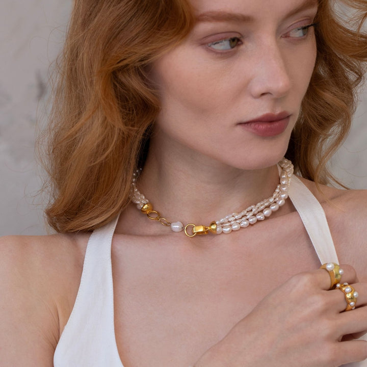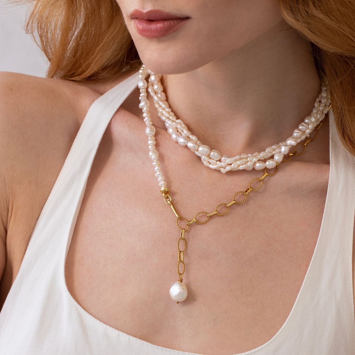 This handcrafted necklace is made from 925 sterling silver with a 22k gold plating and features carefully selected ocean pearls.