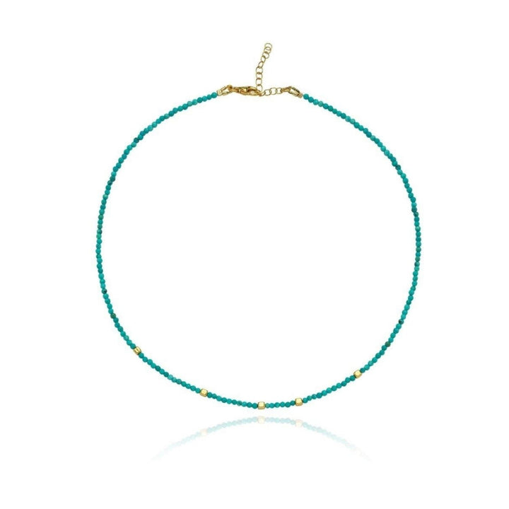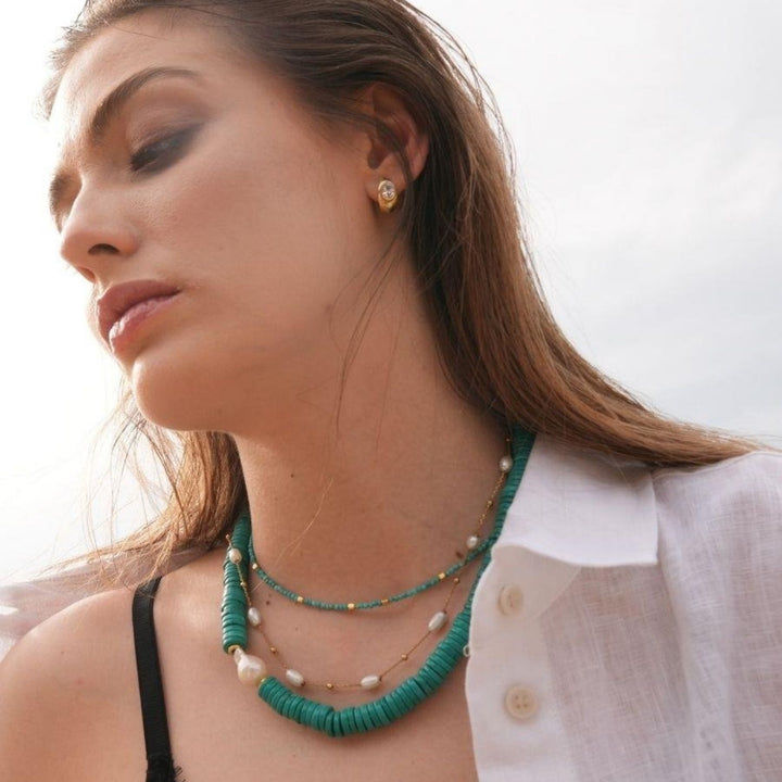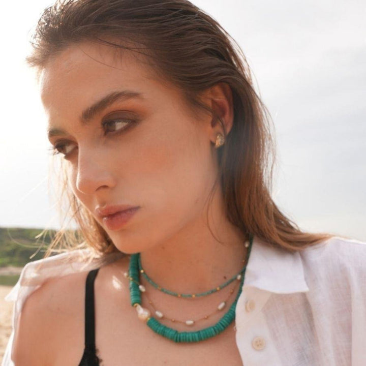 This Lana Turquoise Necklace by Linya Jewellery is an elegant piece that reflects the energy and liveliness of summer. It combines the sleekness of silver with the natural beauty of mini turquoise stones. With its simple and stylish design, this necklace is a versatile accessory that can be worn for both daily use and special occasions, bringing the fresh and lively atmosphere of summer to every moment.