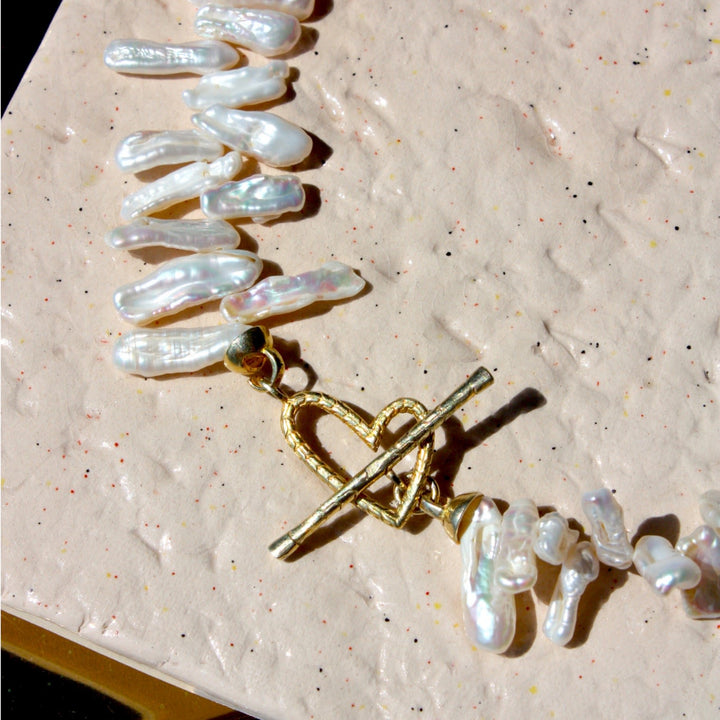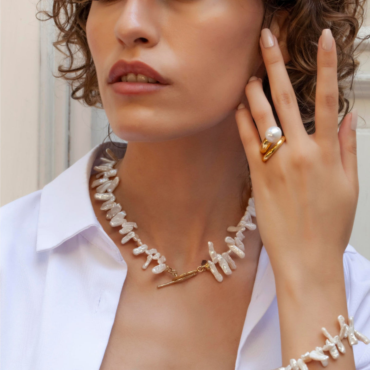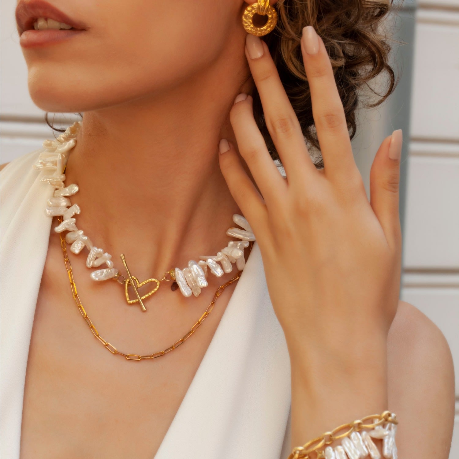 This necklace adds natural elegance to your style, celebrating the unique beauty of nature with asymmetrical baroque pearls. Each pearl has a unique shape, making every necklace one-of-a-kind. It's a durable and high-quality piece designed for long-term use, offering a blend of naturalness and originality.