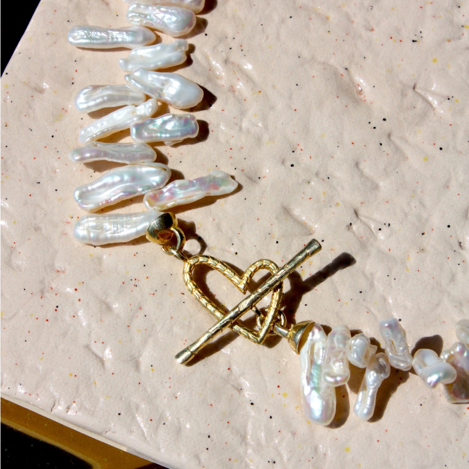 Handcrafted from 925 sterling silver with a protected 22k gold plating and features natural baroque pearls. It is 45cm in length.
