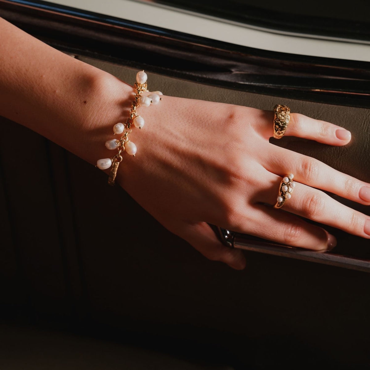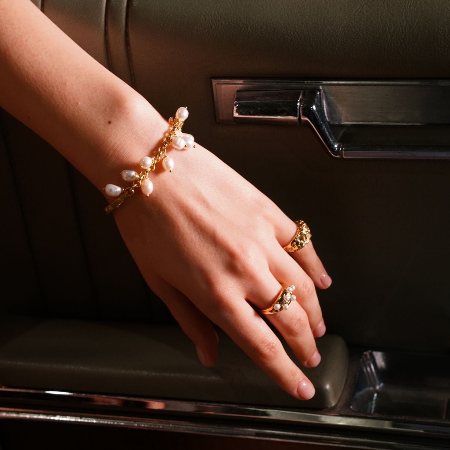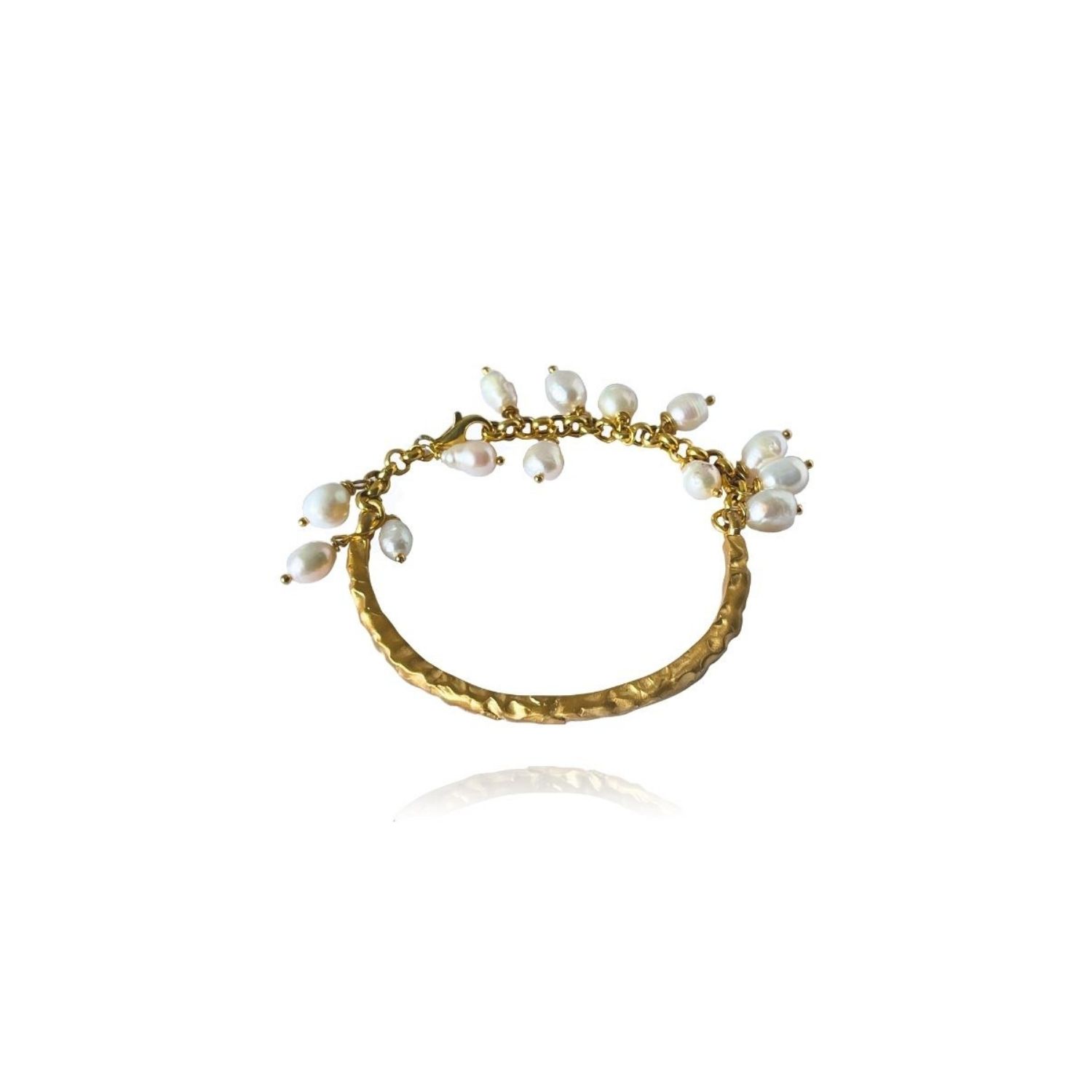 Handcrafted from 925 sterling silver with a dual finish of shiny and matte gold plating, this bracelet features a pearl and an adjustable closure.