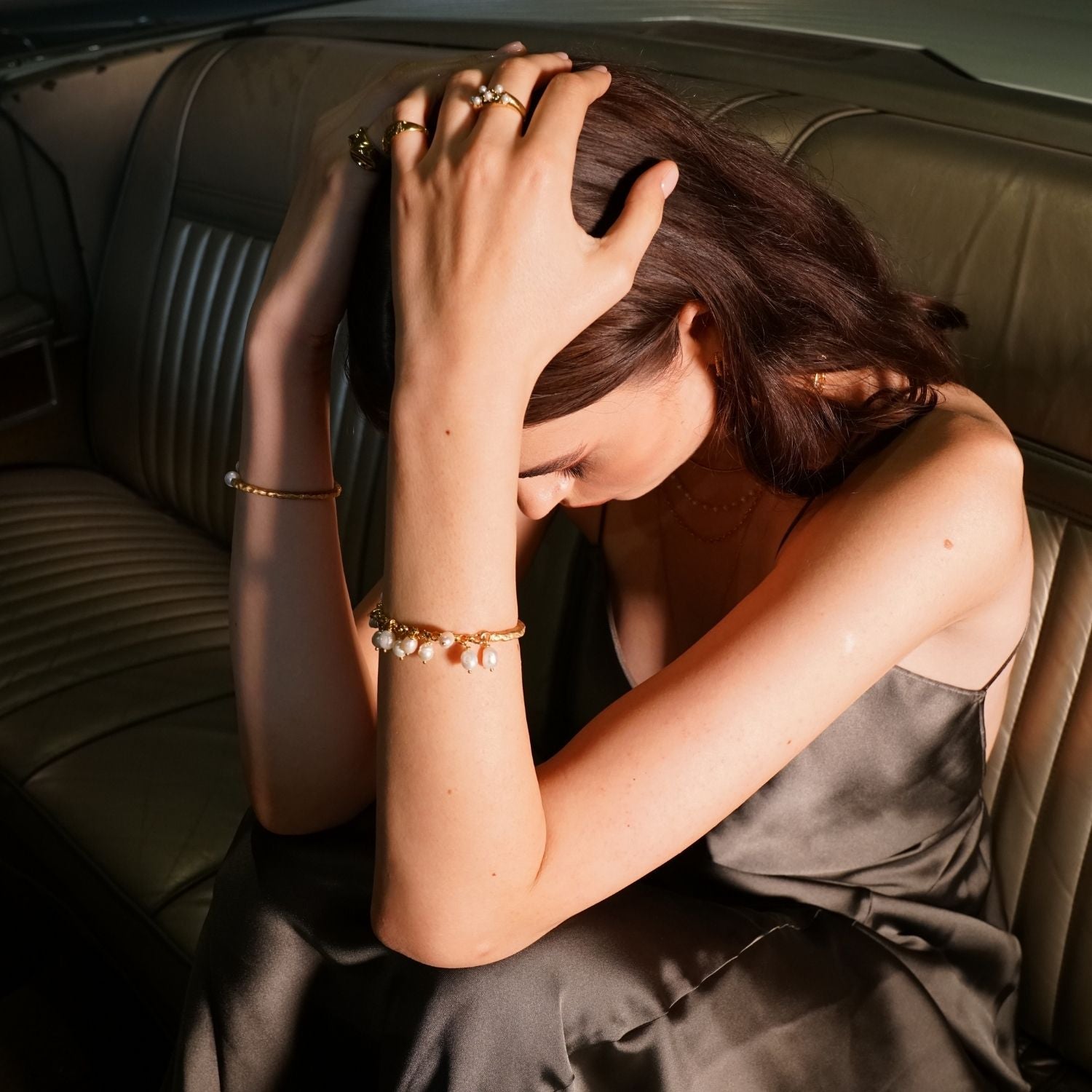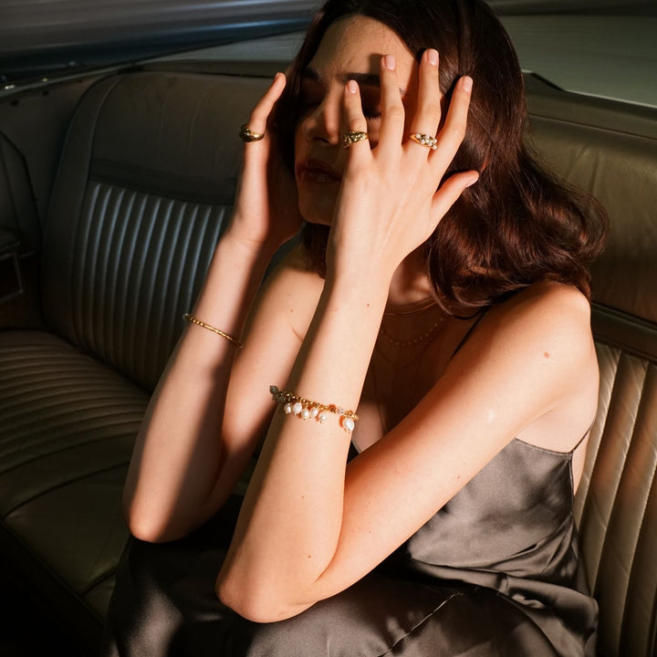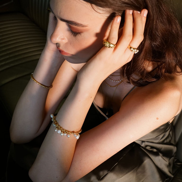 This Layda Amorphous Matte Pearl Bracelet by Linya Jewellery is a unique and captivating design that artfully combines two different finishes for a truly special accessory. It features a triple combination of a half cuff, a chain, and a lustrous pearl, creating a striking blend of modern and classic styles. The elegance of the pearl, the sleekness of the silver cuff, and the subtle gothic flair of the chain come together to form a piece that is both delicate and bold, designed to make every woman feel special. Its adjustable structure ensures a perfect fit.