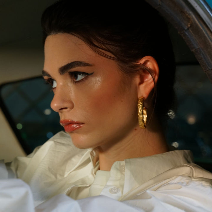 These Rara Amorphous Half Oval Gold Earrings by Linya Jewellery are a stunning blend of vintage charm and modern design. Crafted in an amorphous half-oval shape, the earrings feature a unique engraved surface that evokes a classic vintage feel while their large hoop style ensures they remain a modern, statement piece. This eye-catching design is versatile enough for both daily wear and special occasions, making every moment feel special.