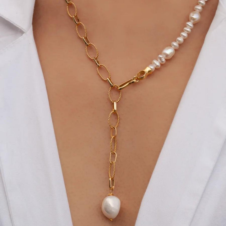 This Baroque Pearl Lariat Dangle Necklace by Linya Jewellery is a sophisticated and versatile piece that highlights the unique beauty of natural pearls. Each baroque pearl has its own irregular shape and natural shine, adding a touch of elegance and originality. The adjustable chain allows it to be worn as a long lariat or a shorter necklace, offering flexibility to match different styles and outfits. This piece is the perfect option to reflect your style with unique elegance and grace.