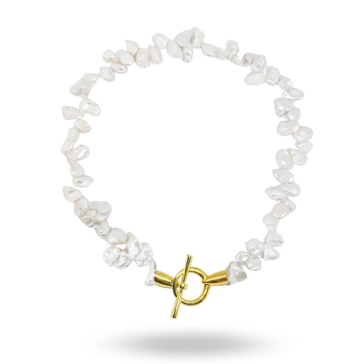 This handcrafted necklace is made from 925 sterling silver with a 22k gold plating and features natural baroque pearls.