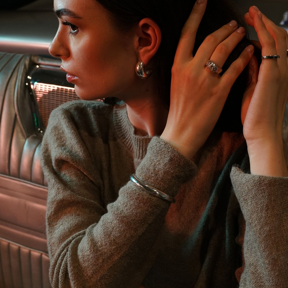 This Grel Thick Asymmetric Silver Bracelet by Linya Jewellery is a modern and stylish accessory that elegantly wraps the wrist. This adjustable cuff is crafted from 925 sterling silver and is available in three different plating colors: shiny gold, matte gold, and matte silver. Its asymmetrical design adds a modern touch to any look, making it a versatile piece for both daily life and special moments.