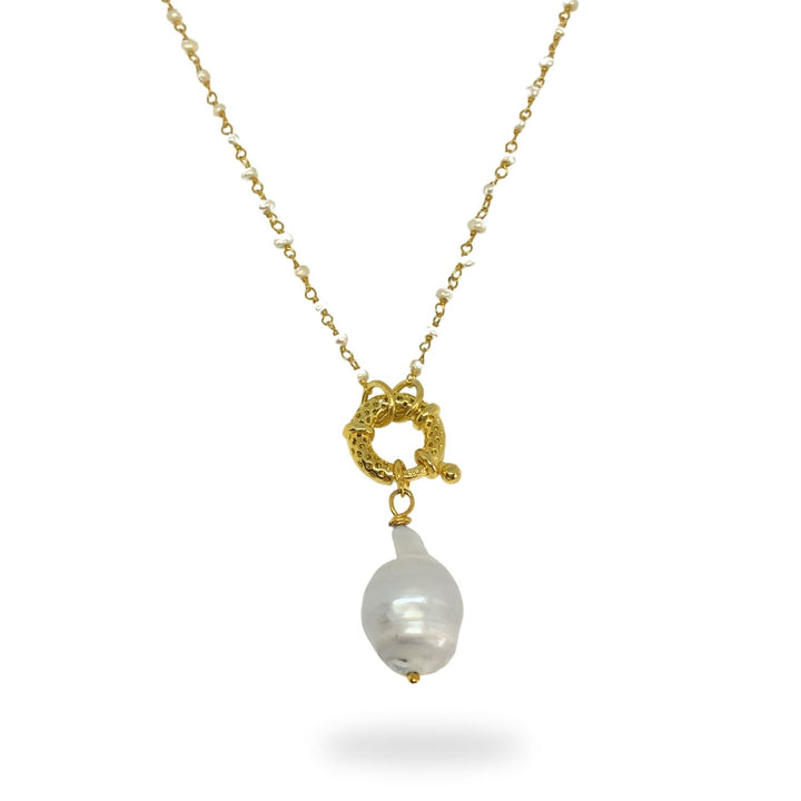 This necklace is handcrafted from 925 sterling silver with 22k gold plating and features a baroque pearl pendant. The necklace length is approximately 50 cm and is adjustable.