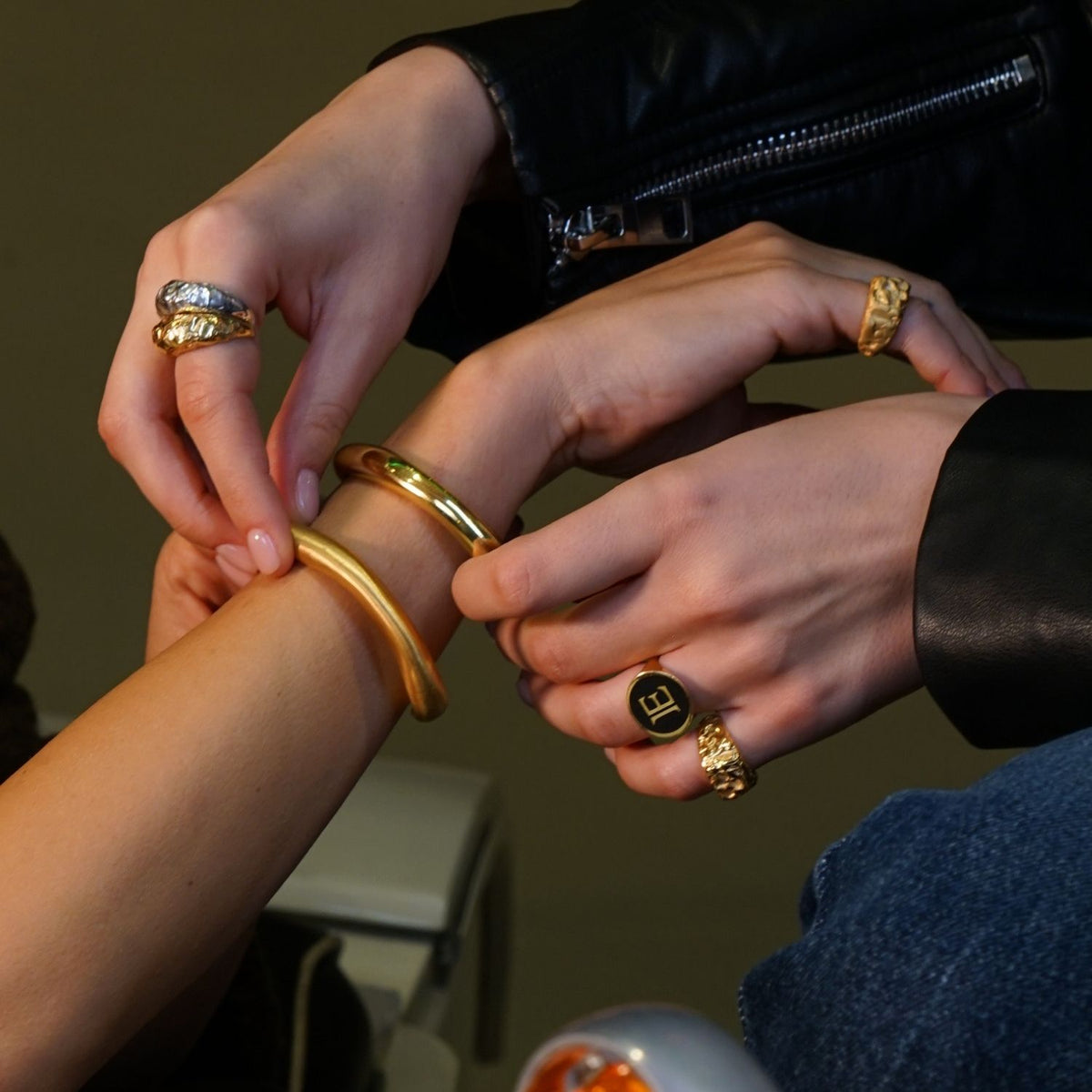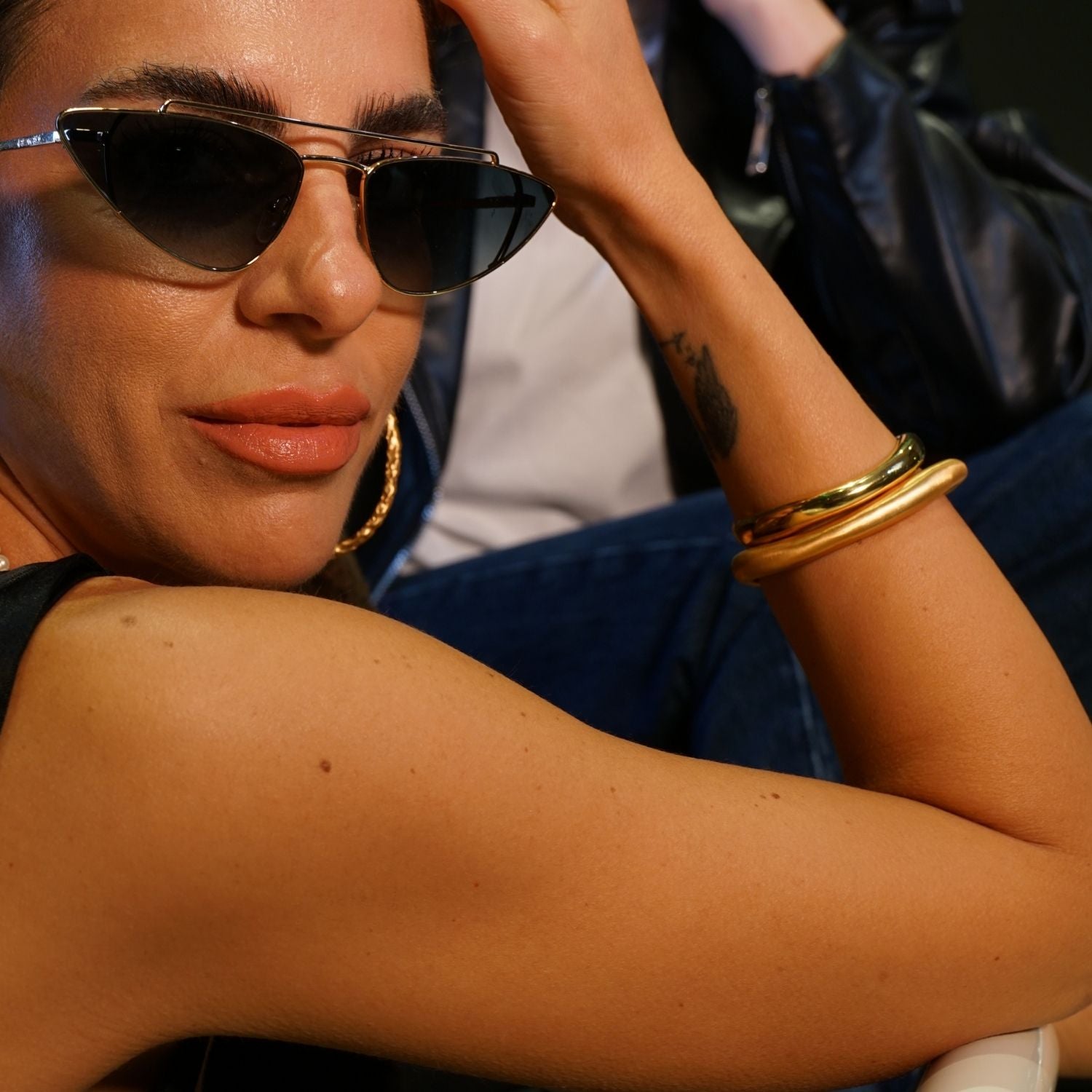 The Grel Thick Asymmetric Matte Gold Bracelet from Linya Jewellery is a modern and stylish cuff that makes a statement. Its asymmetrical design elegantly wraps the wrist, and its adjustable feature ensures a perfect fit. Made from 925 sterling silver with a matte gold finish, this handcrafted piece offers permanent elegance and a modern touch to any look.