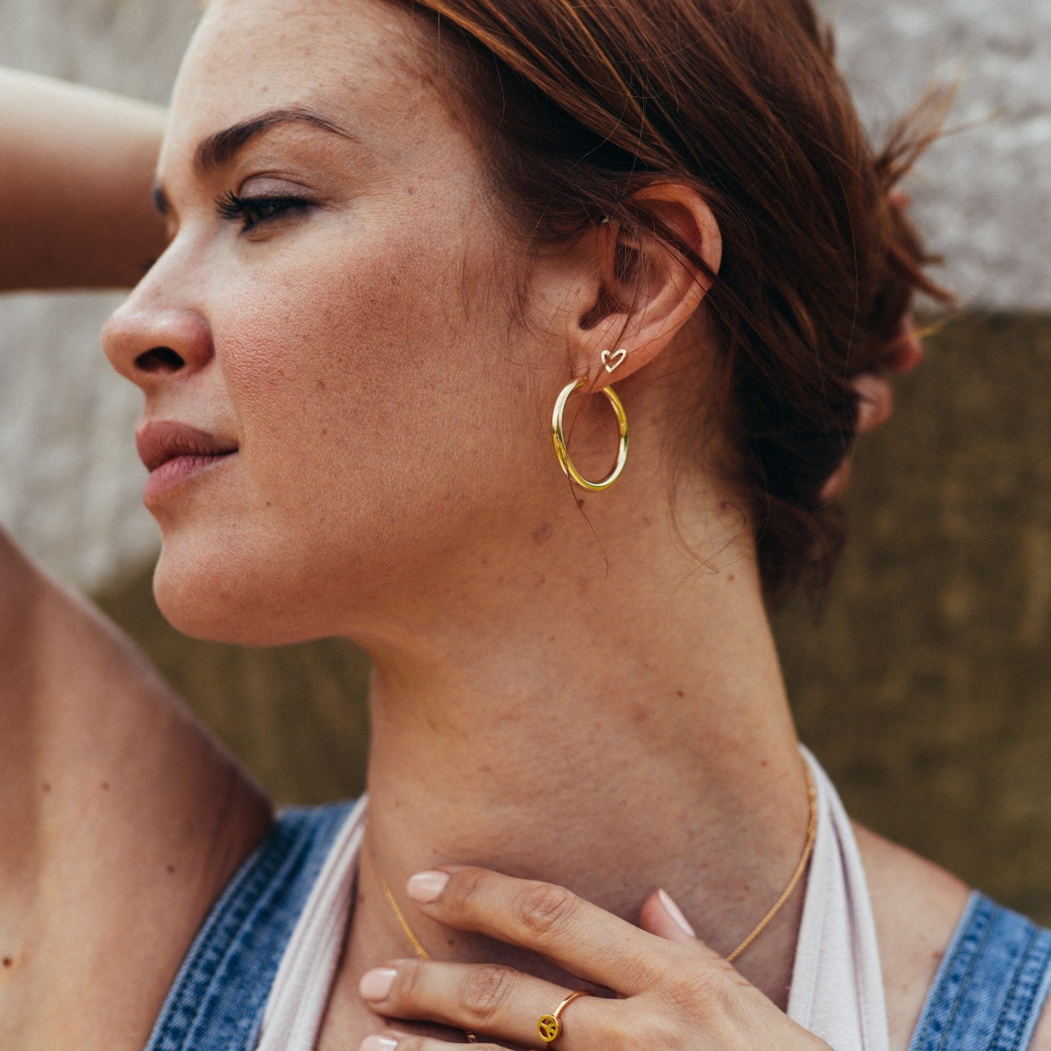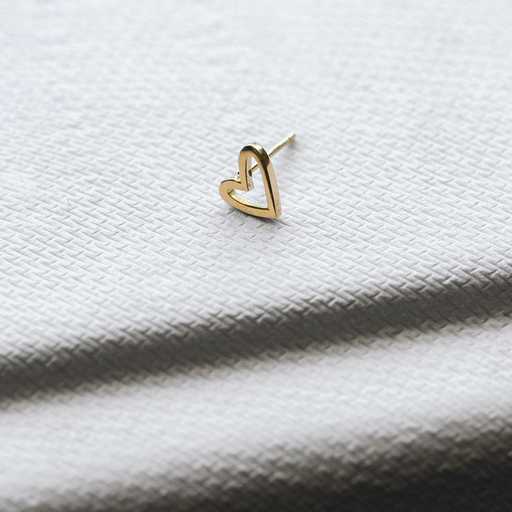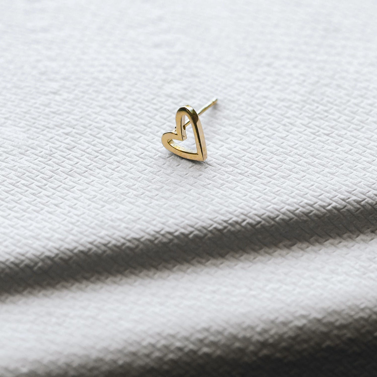 These Love Earrings Gold by Litzi are a charming tribute to the "peace, love, and collaboration" of the 1960s. These stud earrings feature a heart shape, crafted from solid gold. They are a fun and meaningful accessory for daily wear.