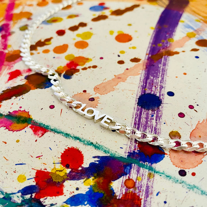 This Goldie Love Chain by Litzi is a new take on an old identity bracelet. The 16-inch chain sits at the collar bone, making a statement all on its own or allowing for layering. This piece is a fun and modern way to "choose love."