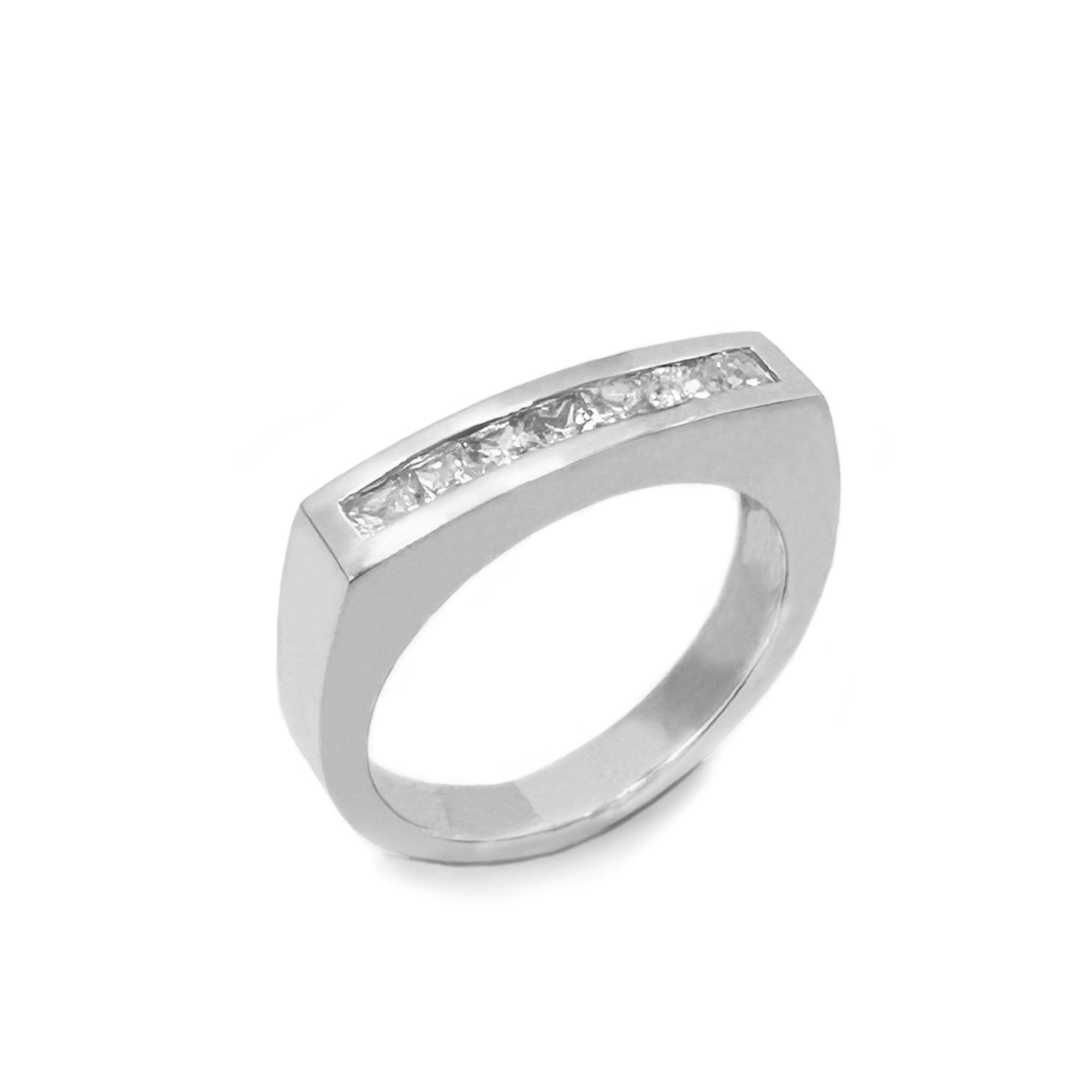 Hand-set in sterling silver with seven 3.5mm colorless princess-cut moissanite stones.
