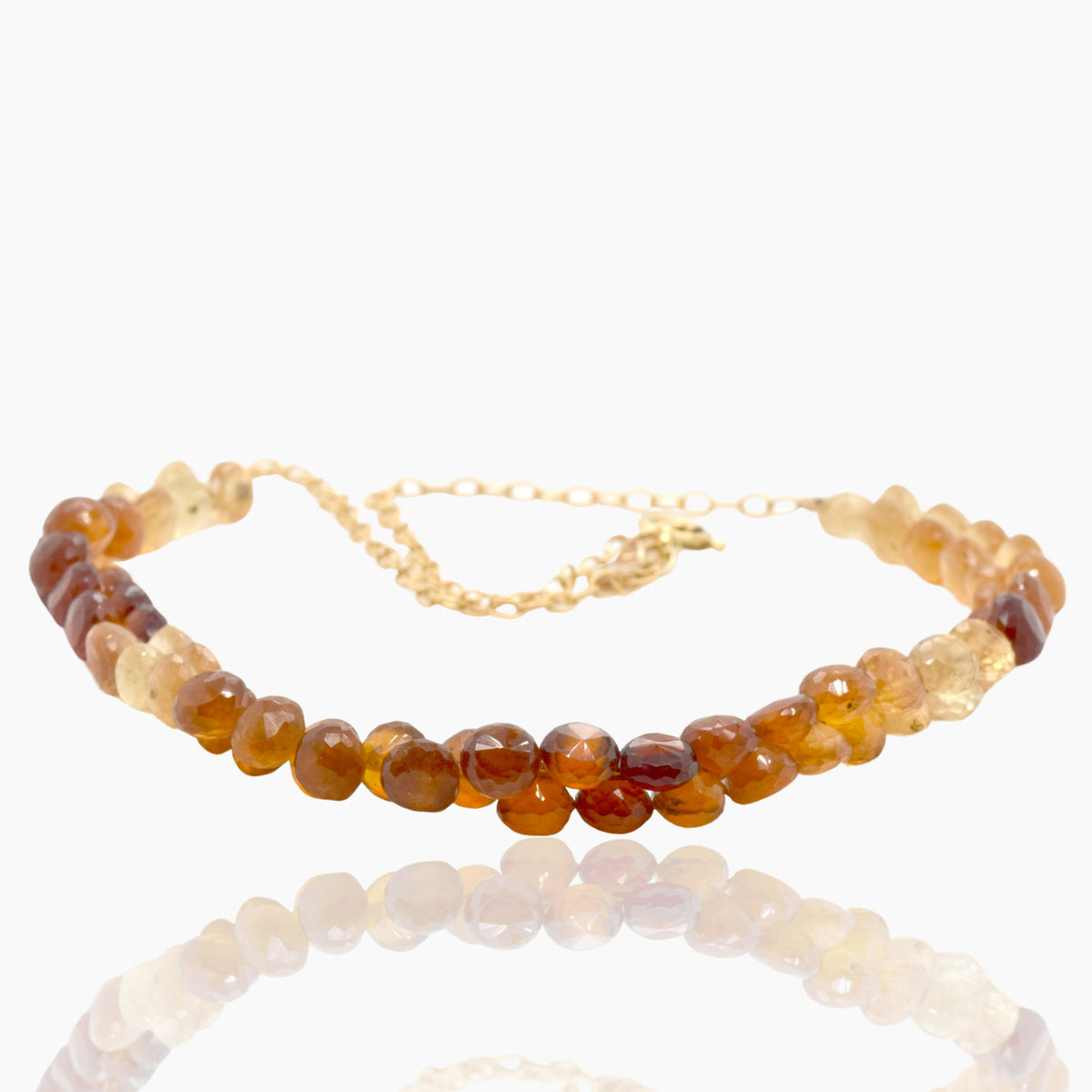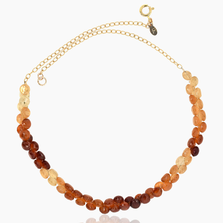 This choker necklace features Hessonite garnet onions on a 14K gold fill chain. The necklace measures 16 inches. It's not recommended to wear the necklace while swimming.