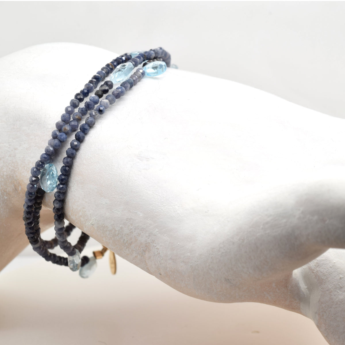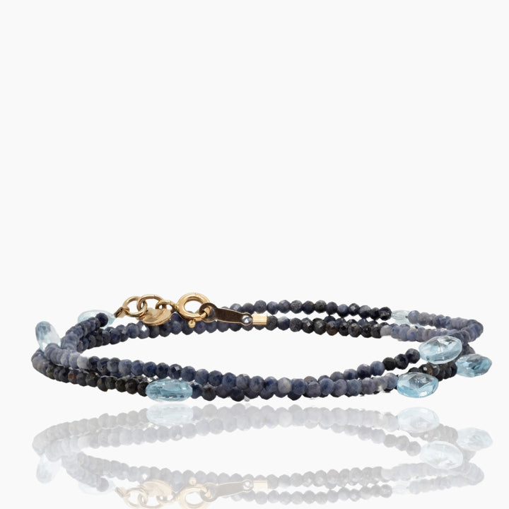 This piece features blue sapphire and sky blue topaz briolettes with 14K gold fill details. It is available in 3 sizes. To maintain its quality, do not wear it in the shower or while swimming. You can clean the stones with a soft cloth.