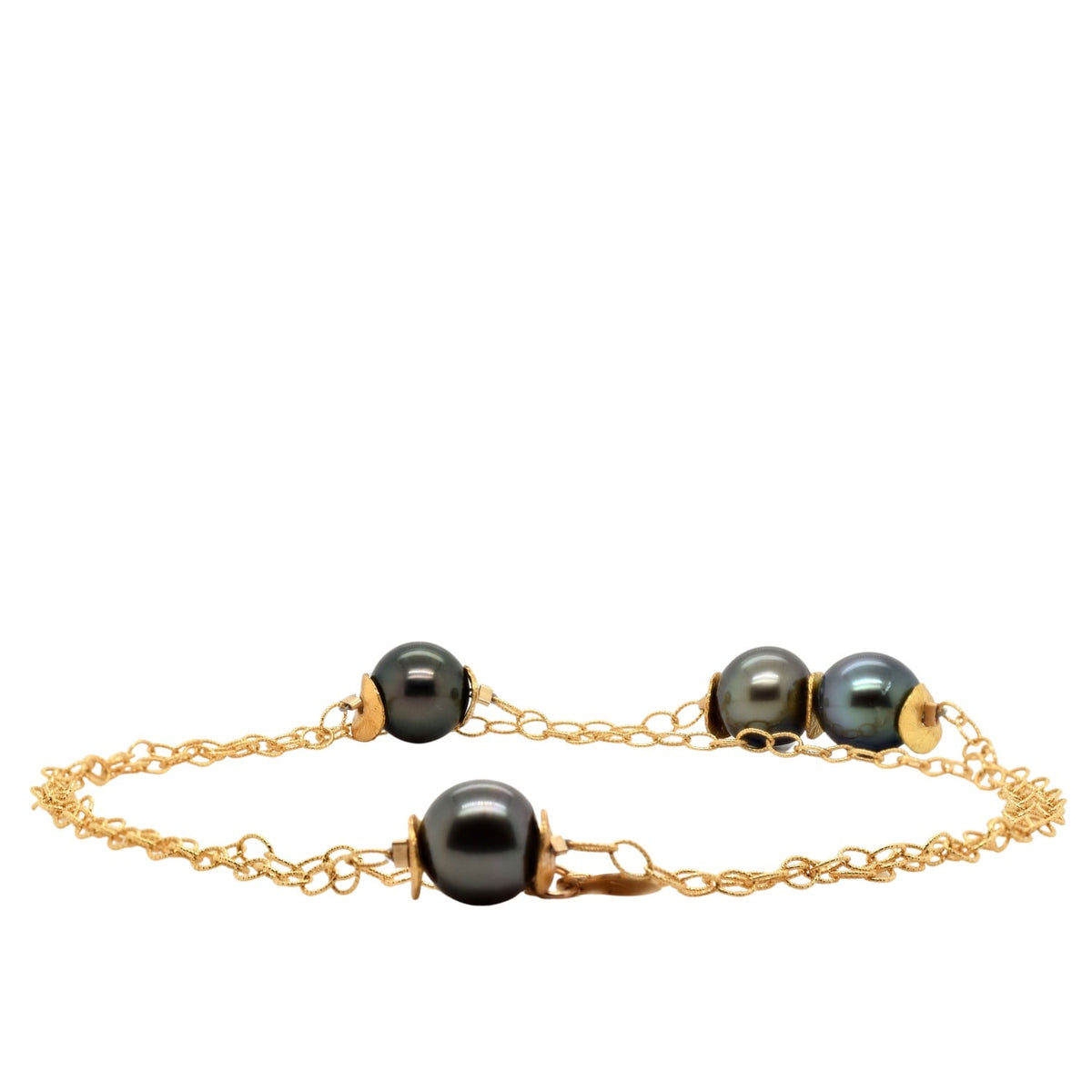 This pearl necklace features four black Tahitian pearls on a 14K gold-fill chain. It is accented with 22K gold vermeil discs and measures 21" in length.