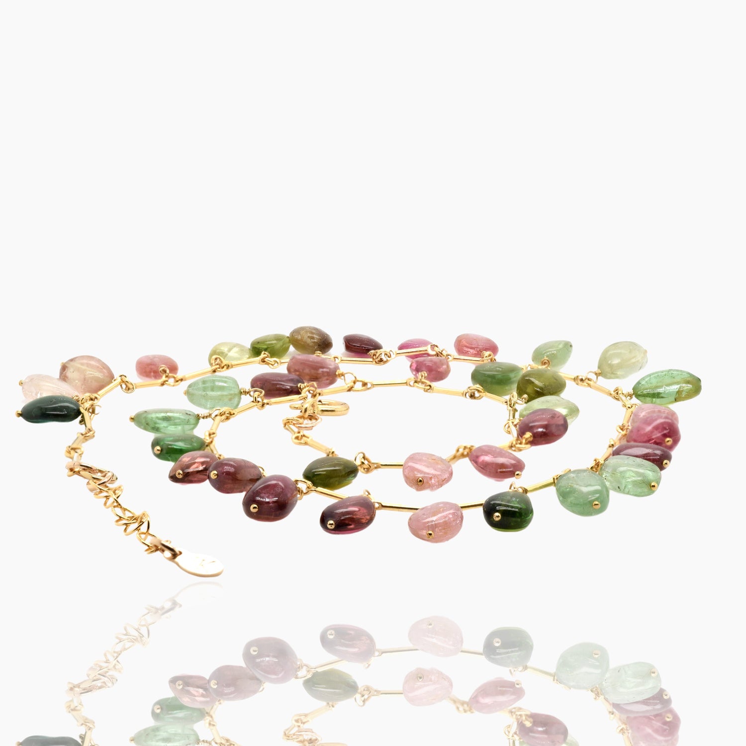 This choker is made from 14K gold fill and features multi-colored tourmaline gems. It measures 16-1/4 inches with a 1-inch extension chain. It has a 14K gold fill spring ring clasp.