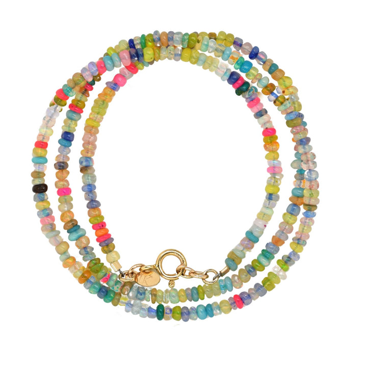 This Triple Wrap Bracelet Multi-Colored Opal / Necklace by Lori Kaplan Design is a versatile and stunning piece. It features a rainbow of colors with Ethiopian opal beads, making it a popular option for stacking. It can be worn as a triple wrap bracelet or a necklace, adding a pop of color to any outfit.