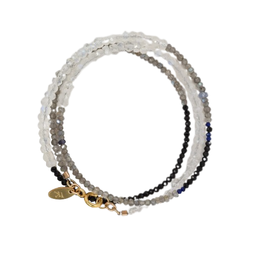 This Triple Wrap Monochromatic Moonstone, Labradorite, Spinel Bracelet Or Necklace by Lori Kaplan Design is a versatile and sophisticated accessory. Each piece is uniquely crafted by hand with moonstone, labradorite, and black spinels. The 14k gold fill findings make this a hearty piece that you will never have to take off.