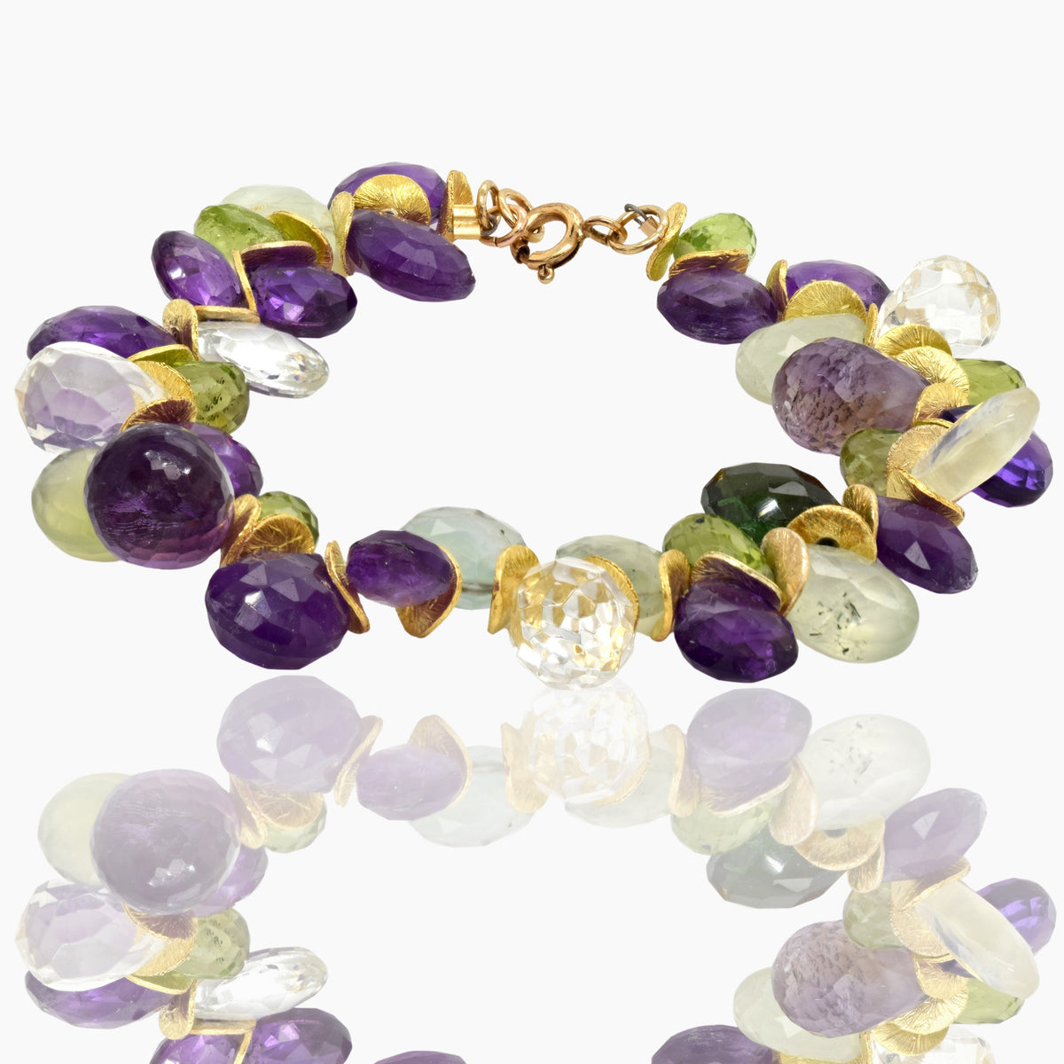 This beaded bracelet is crafted with amethyst, peridot, prehnite, and crystal briolettes. It has 22K gold vermeil details and a 14K gold filled spring ring clasp. It is available in various lengths.