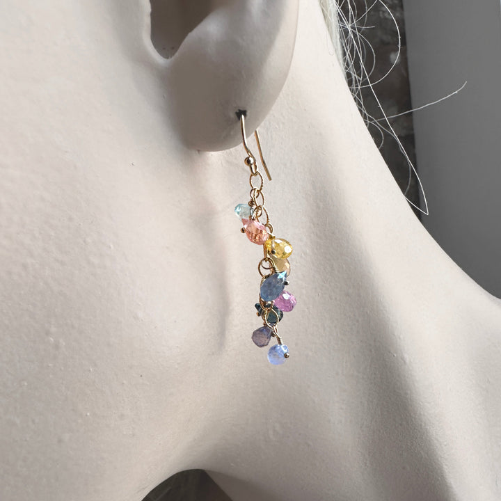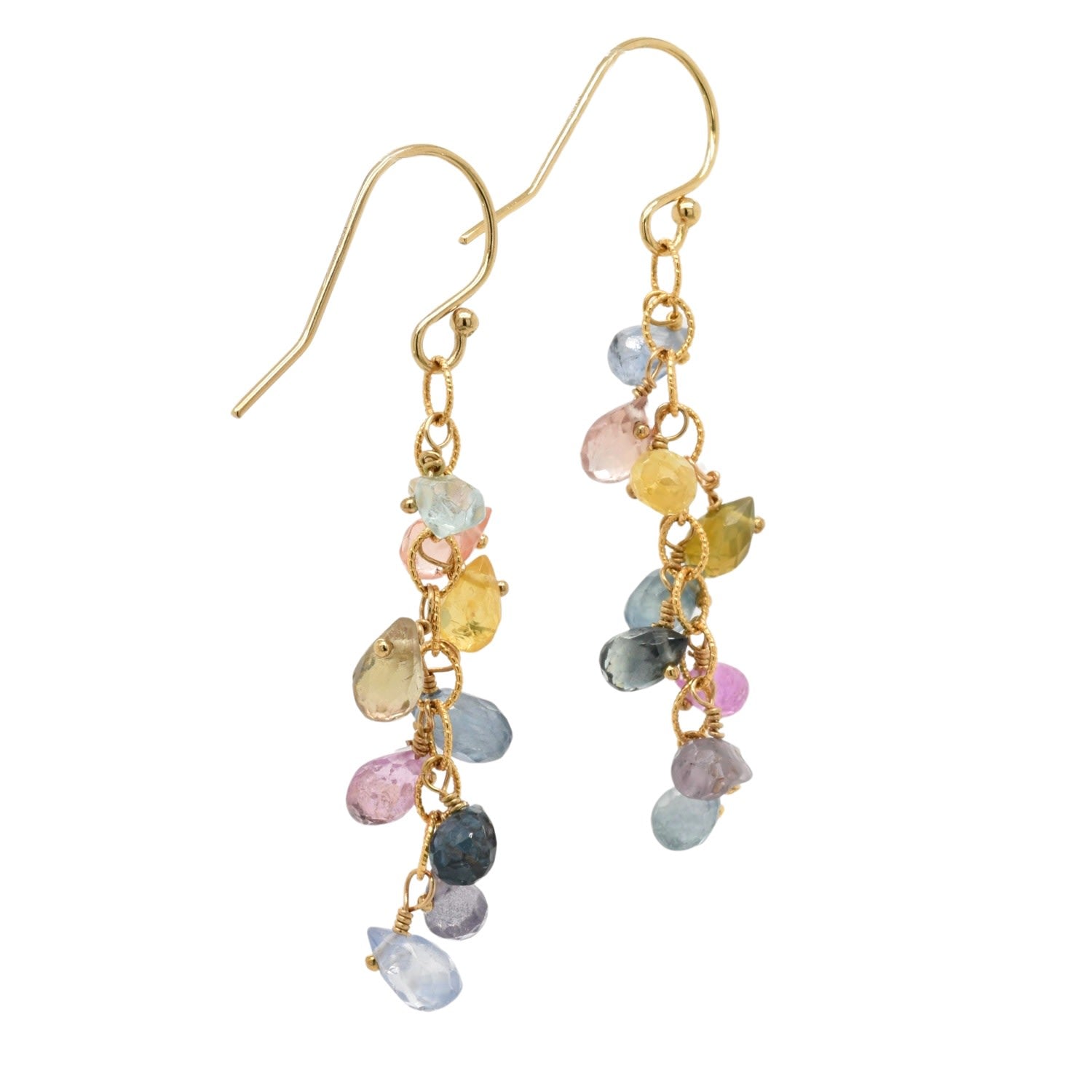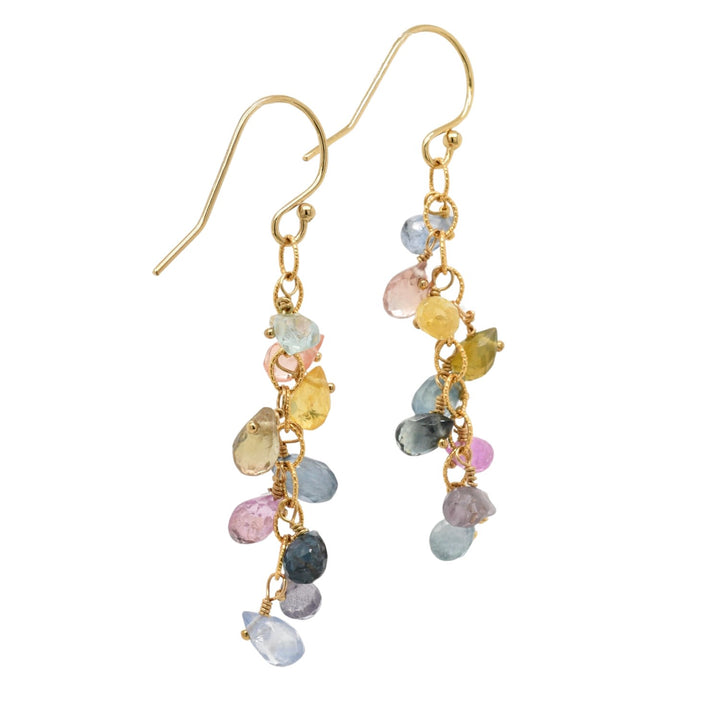 These earrings are handcrafted from 14-karat gold fill wire and feature multi-colored sapphires. They measure 1-1/2" long.