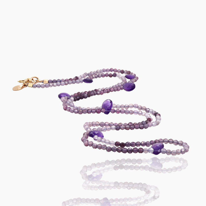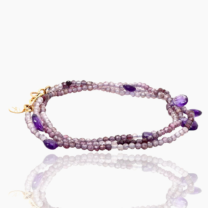 This bracelet is crafted with purple spinel and amethyst briolettes and features 14k gold fill findings. It can be worn as a triple-wrap bracelet or as a single necklace.