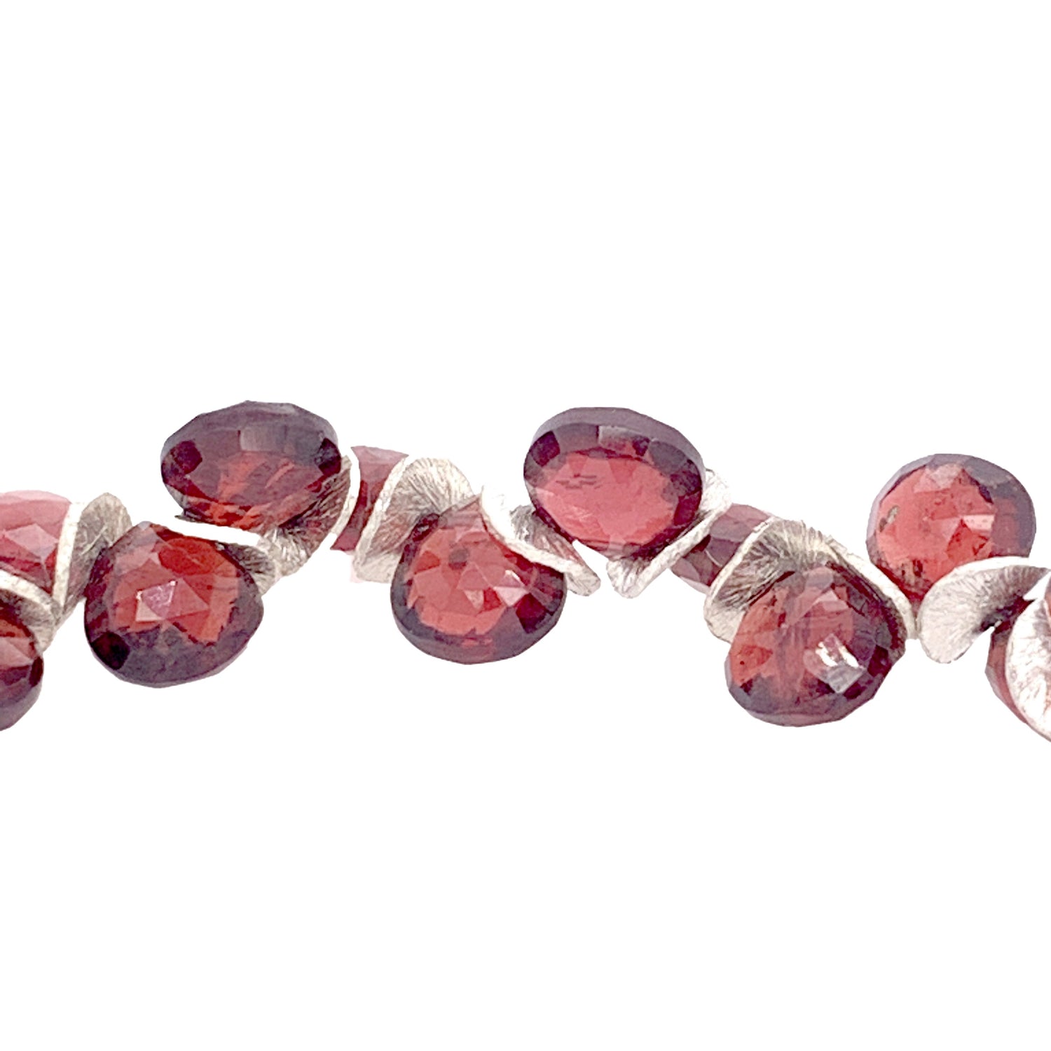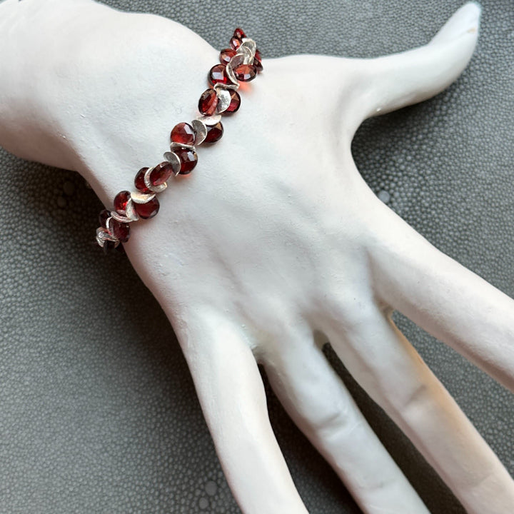 This bracelet is made with garnets and sterling silver discs, secured with a sterling silver spring ring clasp. It is available in 1/2" sizes from 6-9" with an additional 1" extension chain.