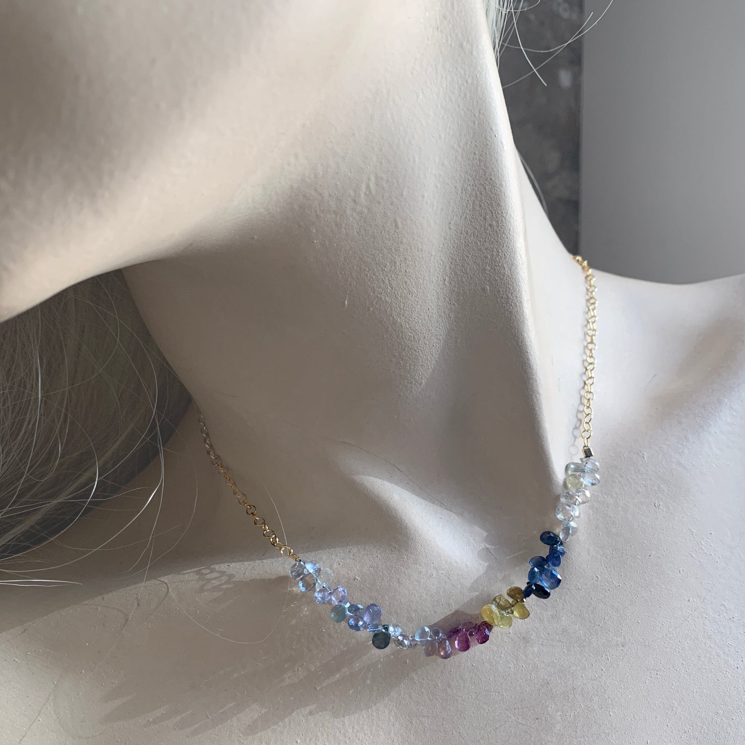 This beaded necklace features a variety of sapphires on a 14K gold fill chain. The total length is 16.5" and the gems portion is 4.5".