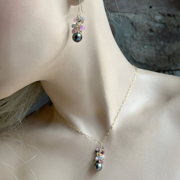 This necklace features a cluster of blue, green, pink, yellow, and clear sapphire briolletes, and a 9.5mm black Tahitian pearl. The chain is a delicate 14K gold fill paperclip style with a spring ring clasp. The necklace measures 16" long.