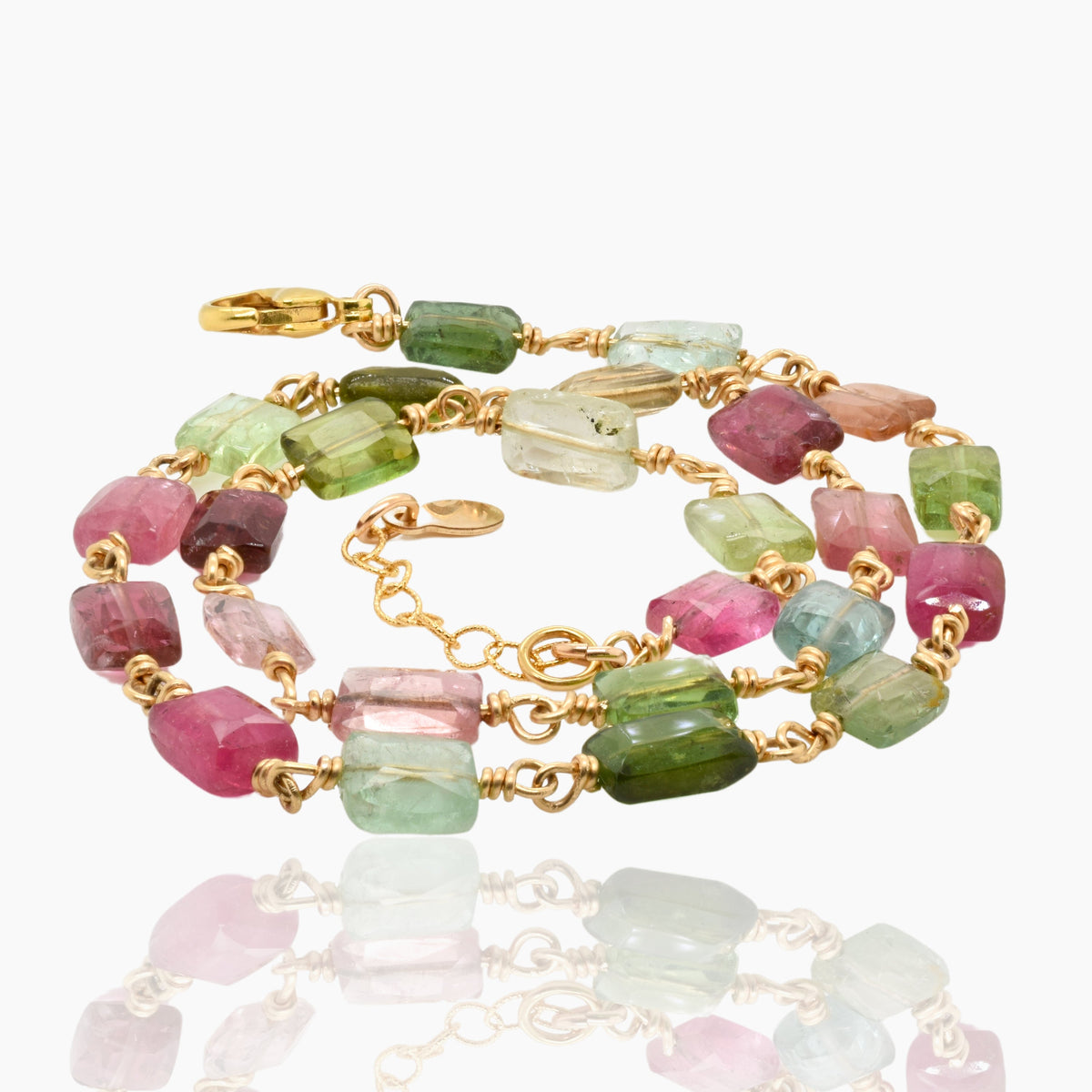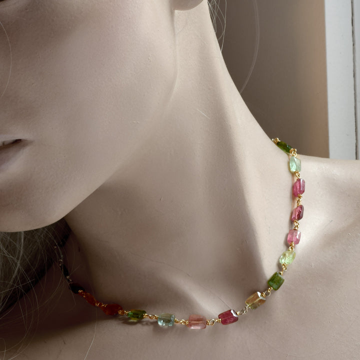 This choker necklace is hand-crafted with faceted tourmaline gems and 14K gold fill wire. It has a secure lobster clasp and measures 15 inches in length.