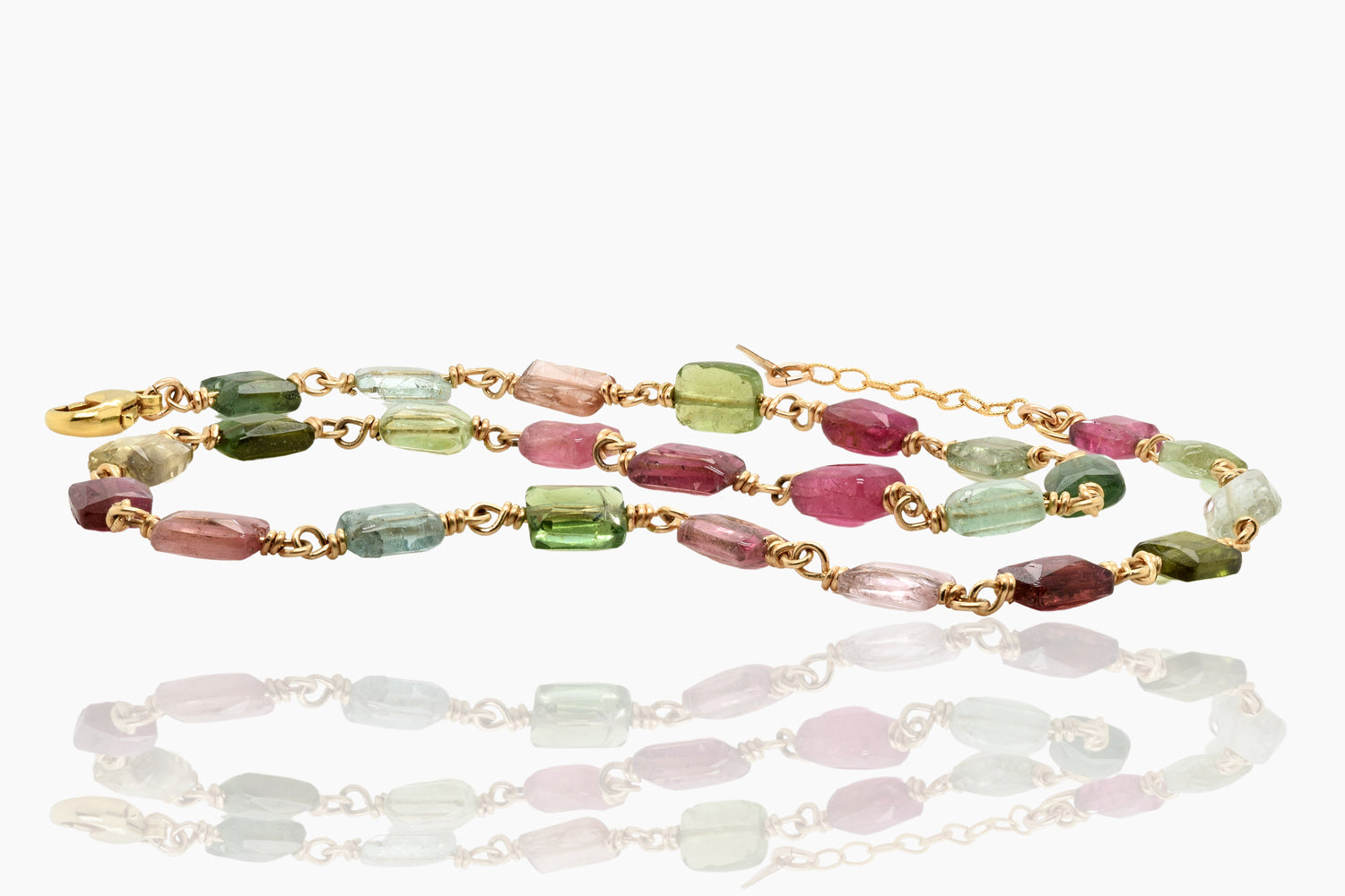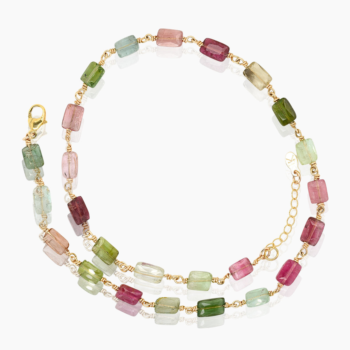 The Multi-Tourmaline Chicklet Gold Choker by Lori Kaplan Design is a vibrant, hand-crafted piece. It features a stunning array of faceted tourmaline gems, bound with 14K gold fill wire, creating a brilliant and colorful necklace. The choker length makes it a gorgeous addition to any wardrobe, and the durable gold fill ensures it will not change color.