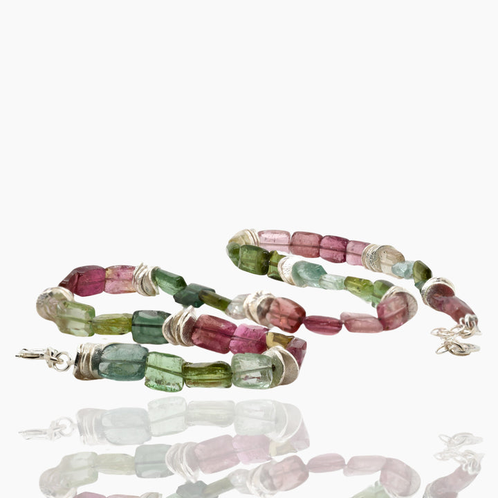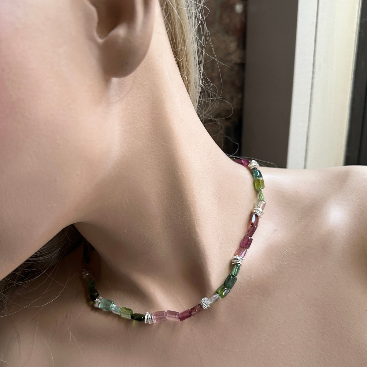 The Watermelon Tourmaline Chicklet Silver Choker by Lori Kaplan Design is a hand-crafted choker necklace that features a brilliant array of tourmaline hues. It has faceted tourmaline gems with sterling silver details and is finished with a sterling silver Spring Ring Clasp. This unique piece measures 15 inches in length and is perfect for a touch of elegance.