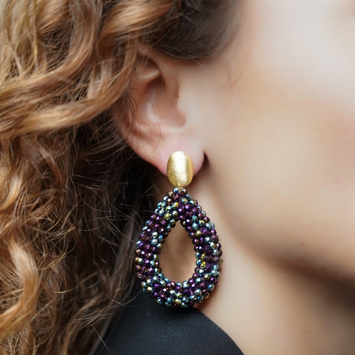 These earrings feature a metallic green and purple finish with a brushed silver, gold-plated stud.