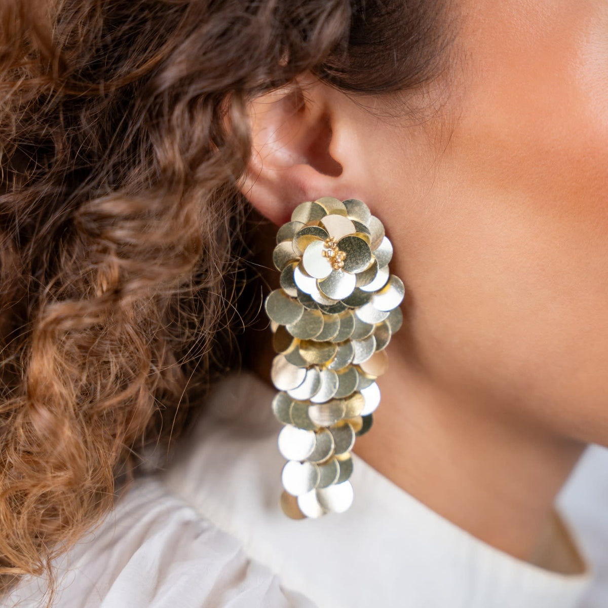 The Gold Sequin Earrings Waterfall L by Lott. Gioielli are stunning dangle earrings with a touch of luxury. They feature cascading gold sequins crafted into flowers that shimmer and catch the light beautifully. The design is bold yet refined, making them perfect for special occasions. They are gold-plated and lightweight for all-day comfort.