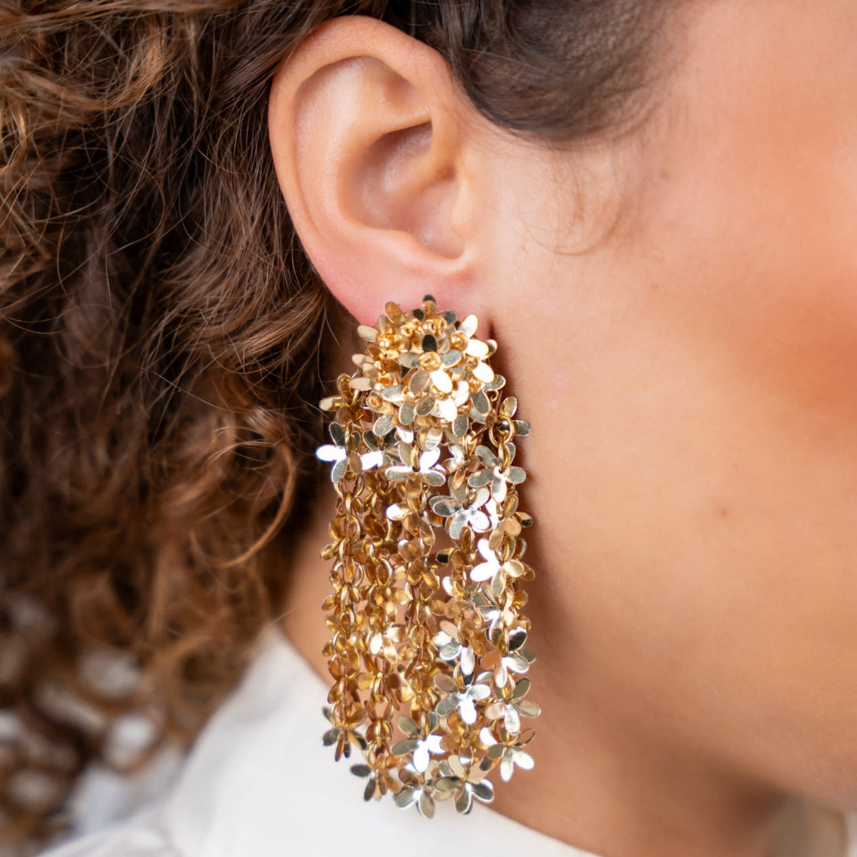 These earrings are made with gold-plated brass, and the flowers are crafted from shimmering sequins. They are lightweight and comfortable for all-day wear.