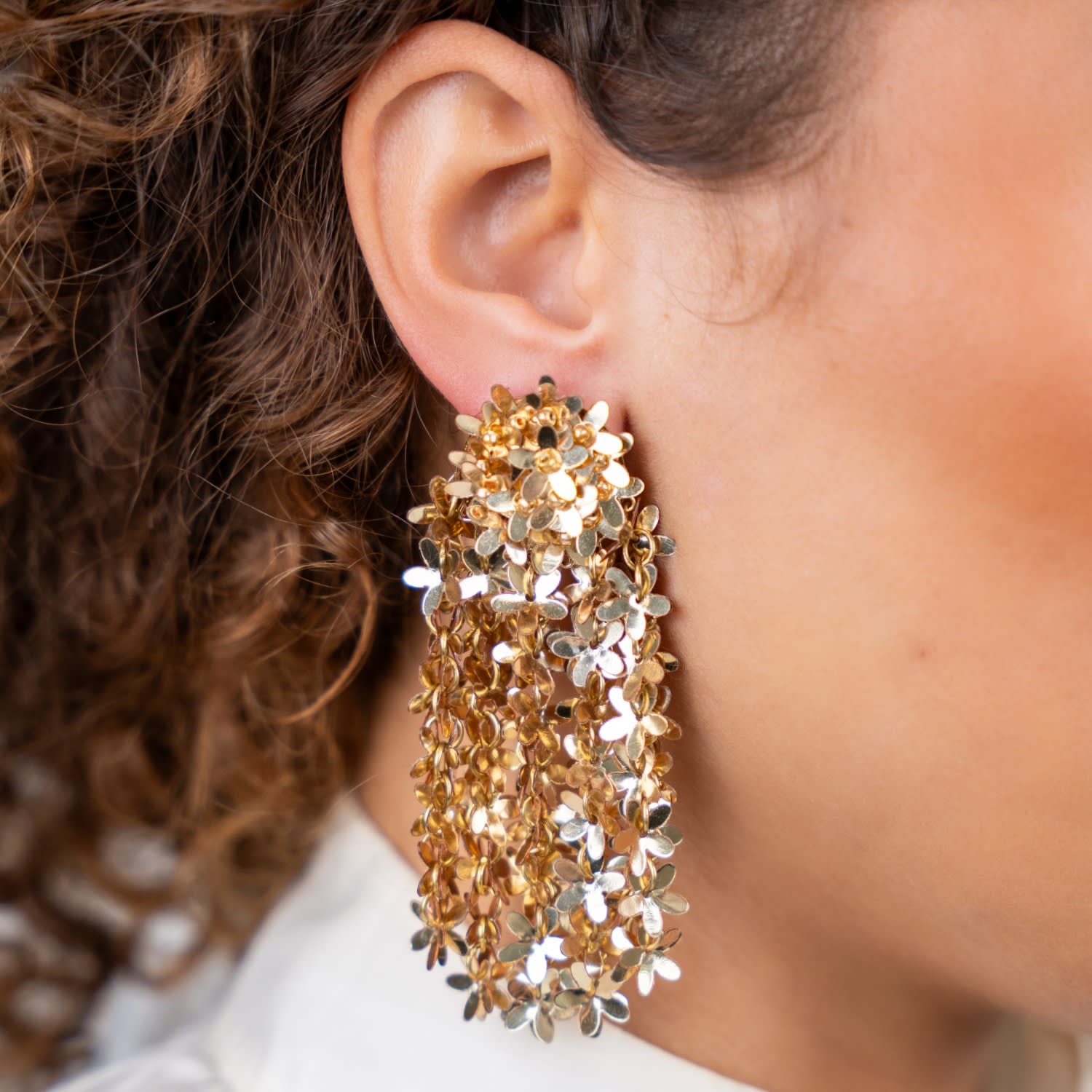 These Gold Sequin Flower Rain Earrings by Lott. Gioielli are a stunning accessory that will make a lasting impression. The cascading gold flowers, crafted from shimmering sequins, create a radiant sparkle with every movement. Despite their bold design, they remain lightweight and comfortable, making them perfect for both special occasions and elevating your everyday style.