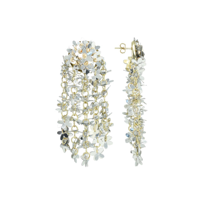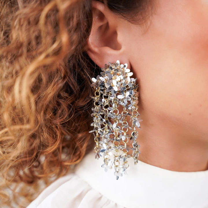 The Silver Sequin Flower Rain Earrings by Lott. Gioielli make a lasting impression with their mesmerizing sparkle. These lightweight dangle earrings feature cascading silver flowers delicately crafted from shimmering sequins. Despite their bold design, they are comfortable to wear for special occasions or to elevate everyday style.